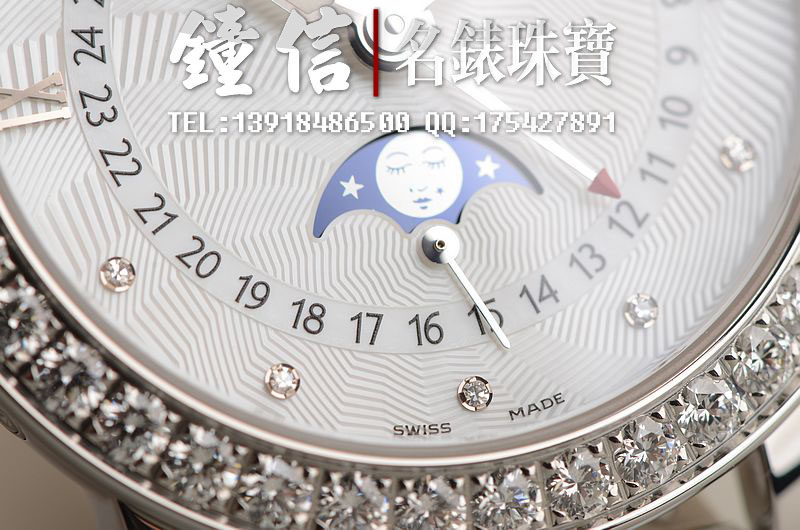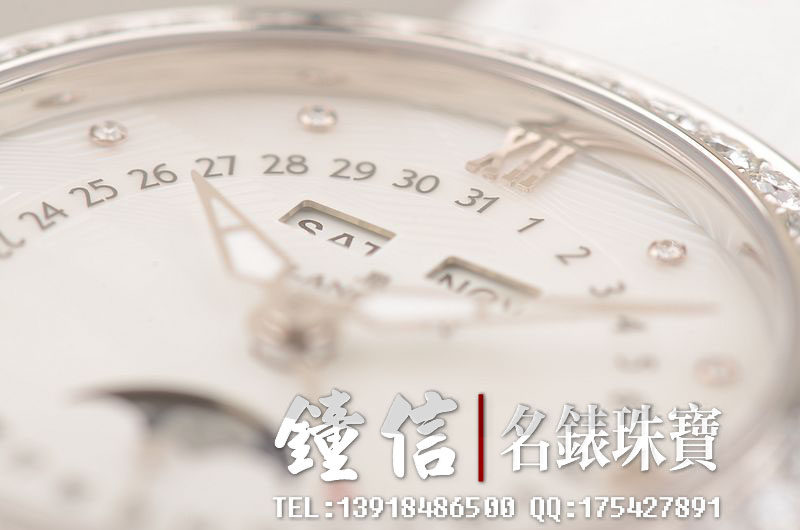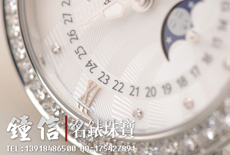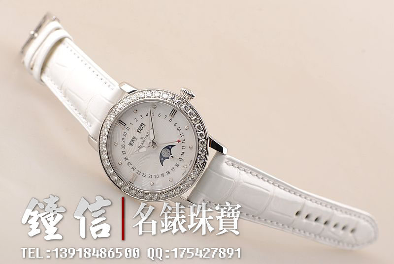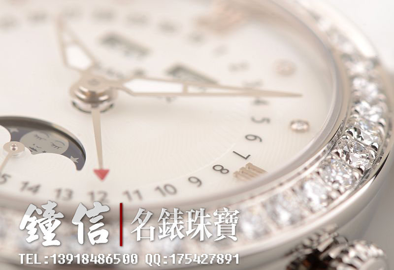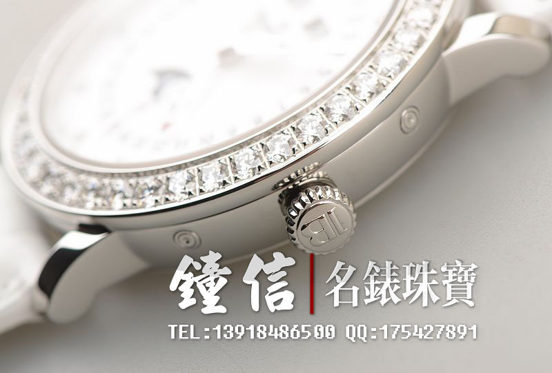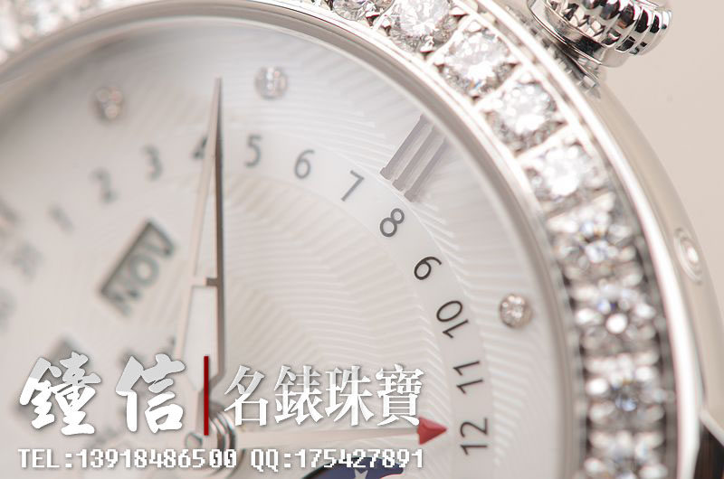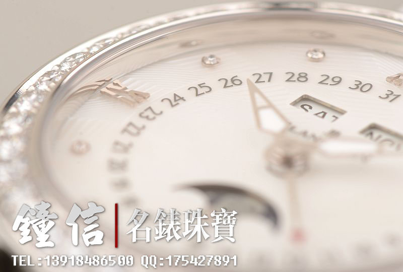 精钢镶钻表壳及折叠式表扣,后配全新白色鳄鱼皮表带。蓝宝石水晶镜面及底盖,立体白色珍珠贝母镶钻表盘,夜光时分针,全历,月相功能。口径35MM*10.57MM。防水30M。全部原厂镶钻,共计1.95克拉。