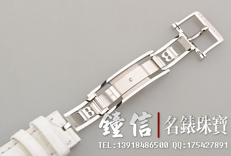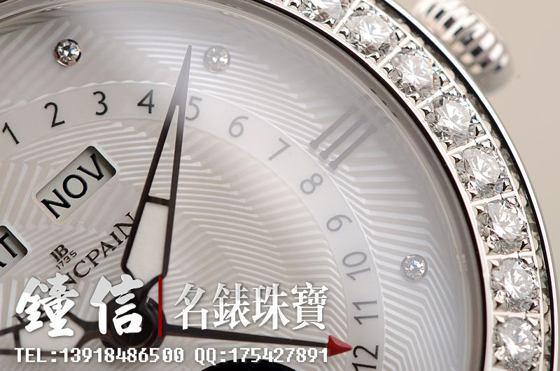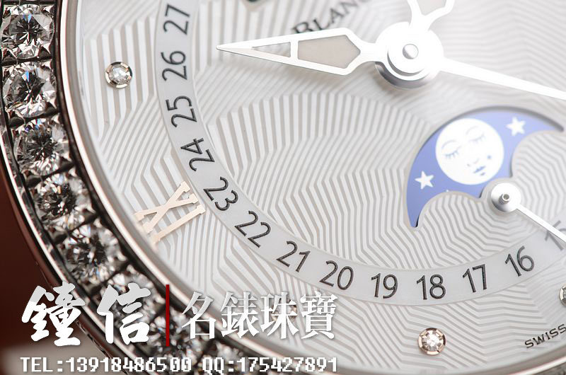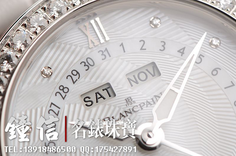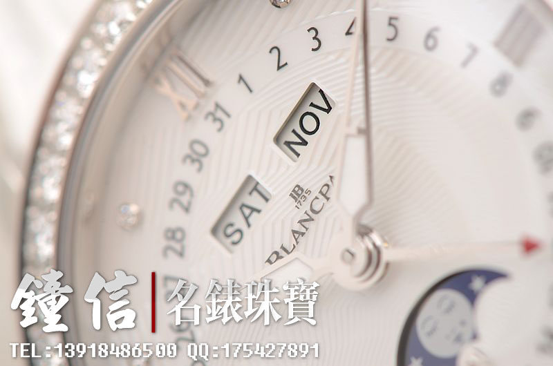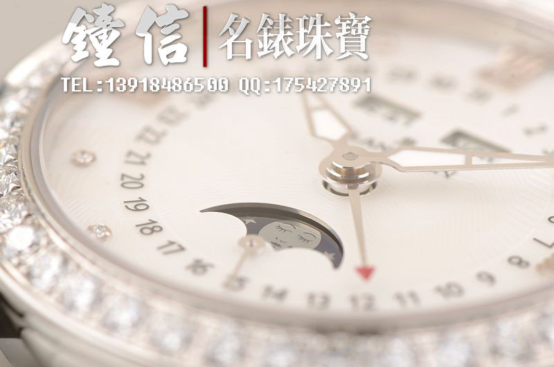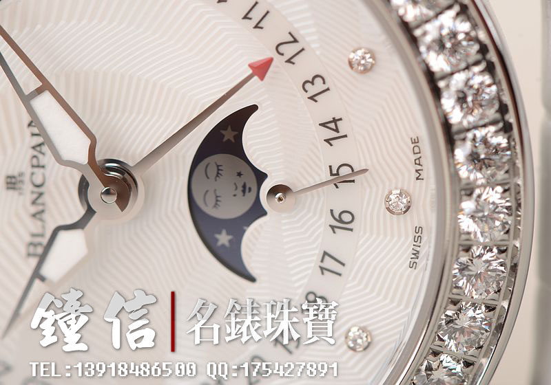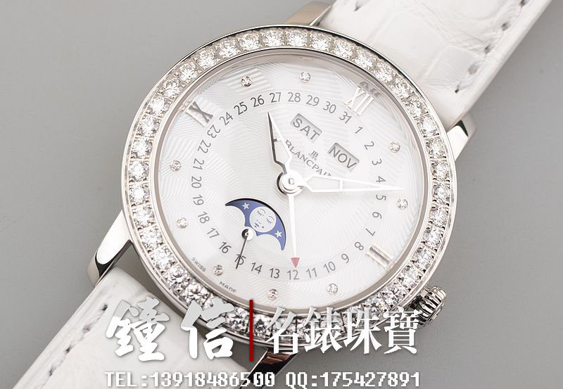 精钢镶钻表壳及折叠式表扣,后配全新白色鳄鱼皮表带。蓝宝石水晶镜面及底盖,立体白色珍珠贝母镶钻表盘,夜光时分针,全历,月相功能。口径35MM*10.57MM。防水30M。全部原厂镶钻,共计1.95克拉。