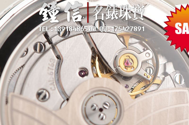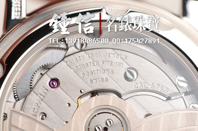 JB自产的CAL.6763机芯,自动机械,由262个零件组成,极其精致日内瓦条纹打磨,倒角抛光修饰,30钻,摆频21600,5方位校正,动力储存高达100小时,四天链。走时状态极佳。