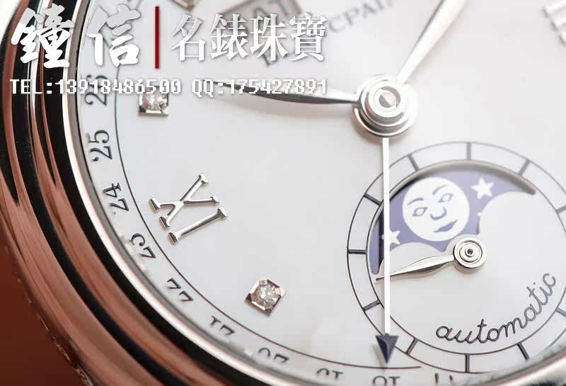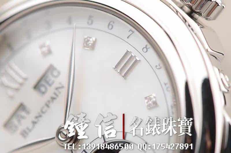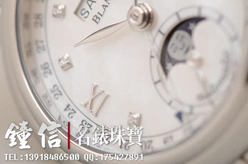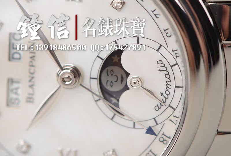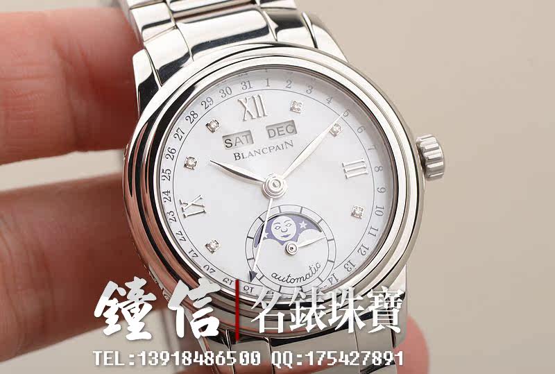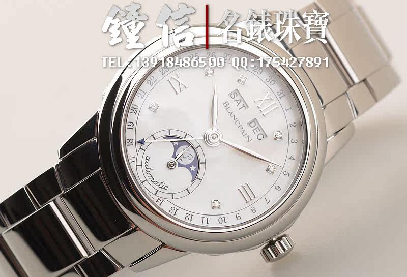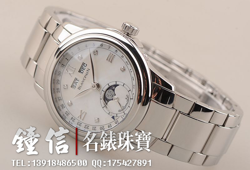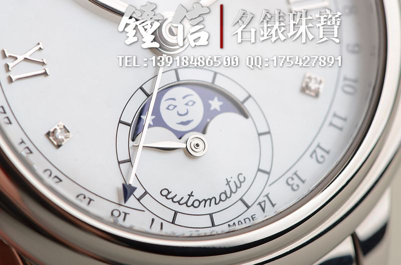 精钢表壳及链带,双向按压式折叠表扣。蓝宝石水晶镜面,立体珍珠贝母钻石刻度表盘,全历,月相功能。口径34MM*11.4MM。防水30M。