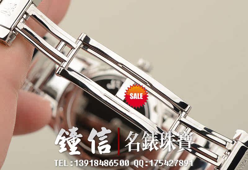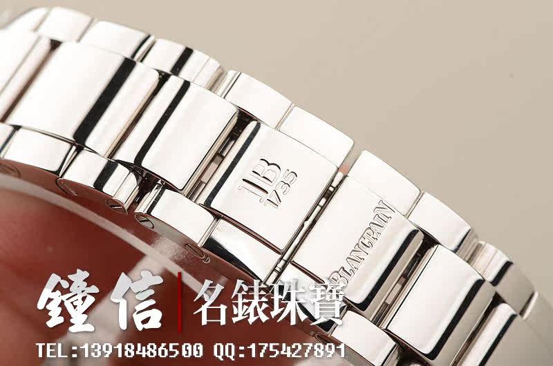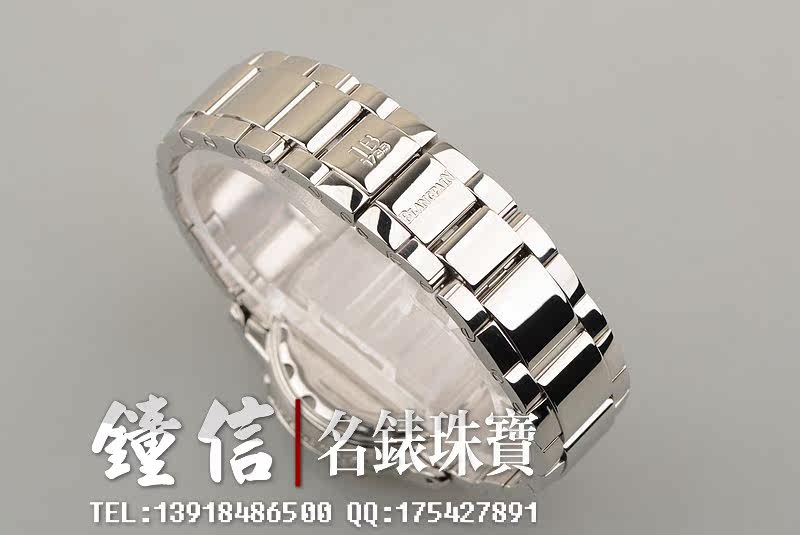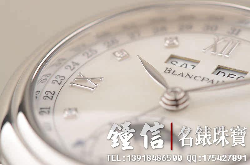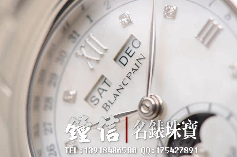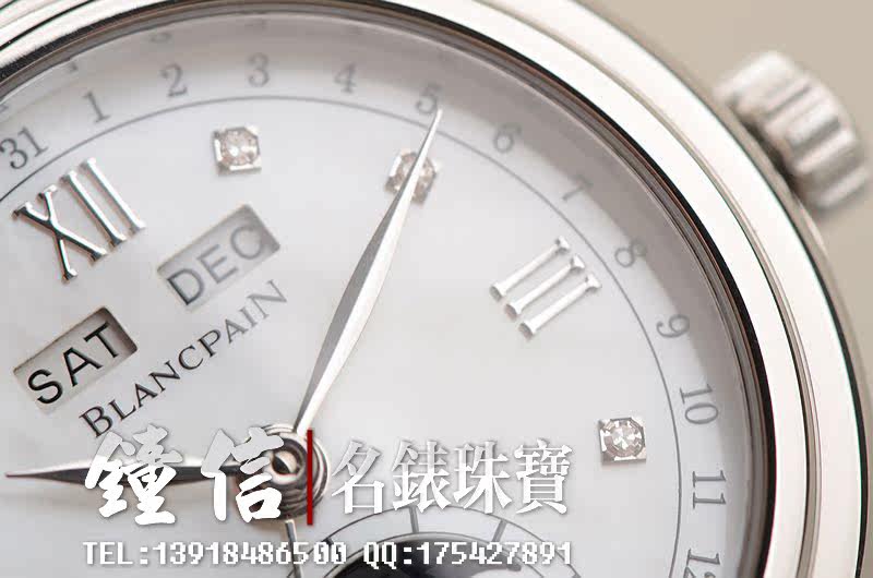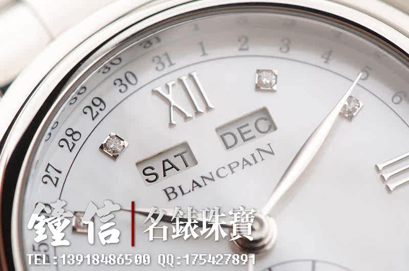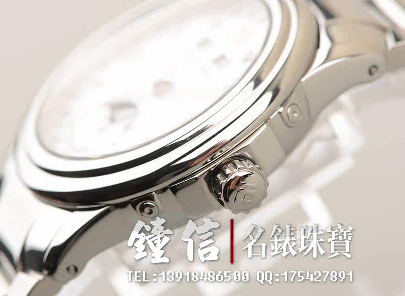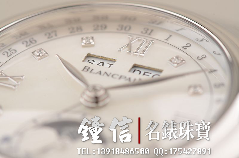 精钢表壳及链带,双向按压式折叠表扣。蓝宝石水晶镜面,立体珍珠贝母钻石刻度表盘,全历,月相功能。口径34MM*11.4MM。防水30M。
