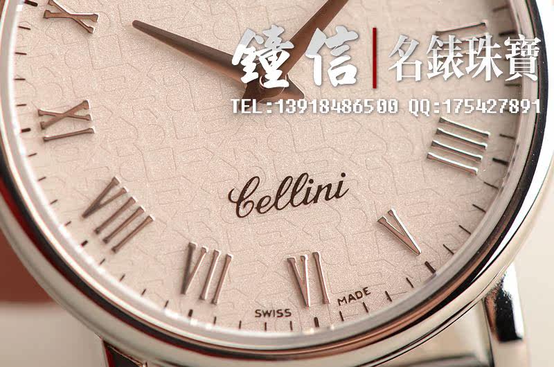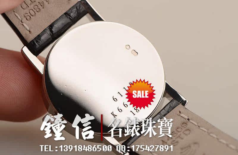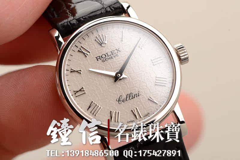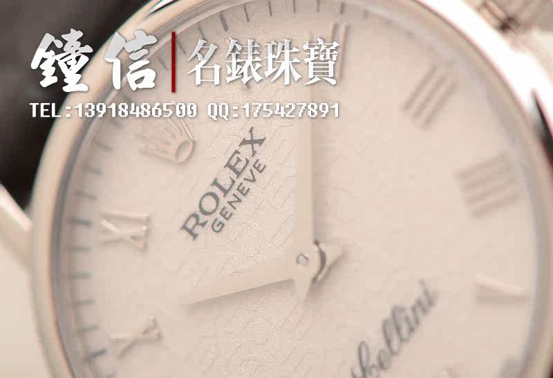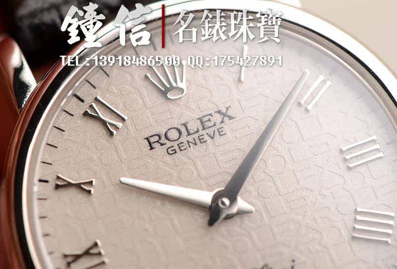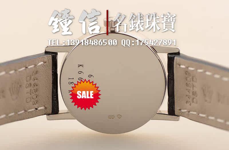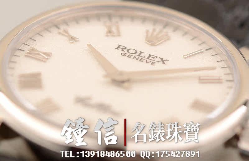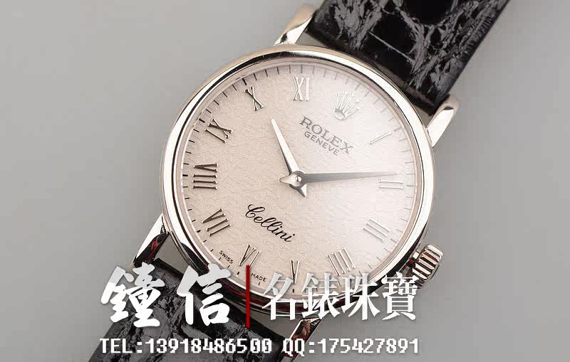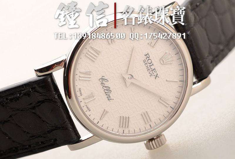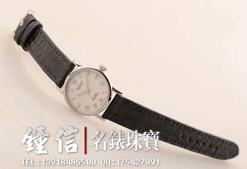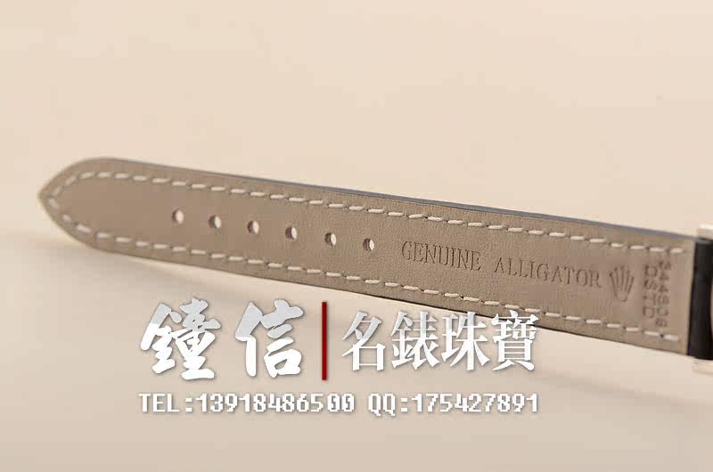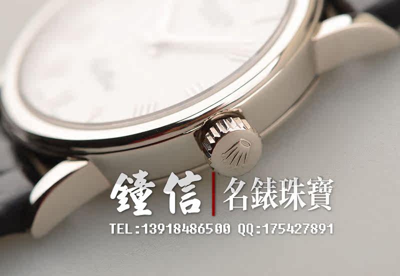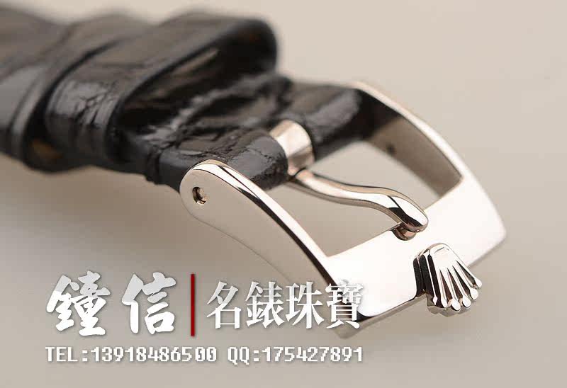 18K白金表壳及表扣,圣伯纳狗头印记。后配全新黑色圆纹鳄鱼皮表带。蓝宝石水晶镜面,立体乳白色磨砂劳力士暗纹表盘,白金罗马刻度及指针,口径25MM*5.3MM。防水30M。