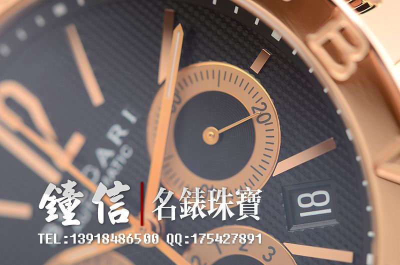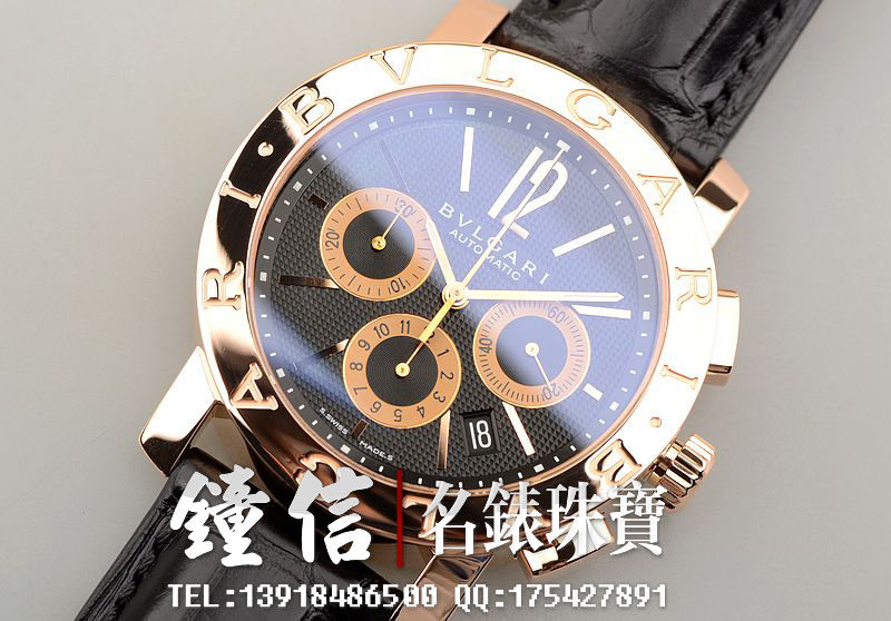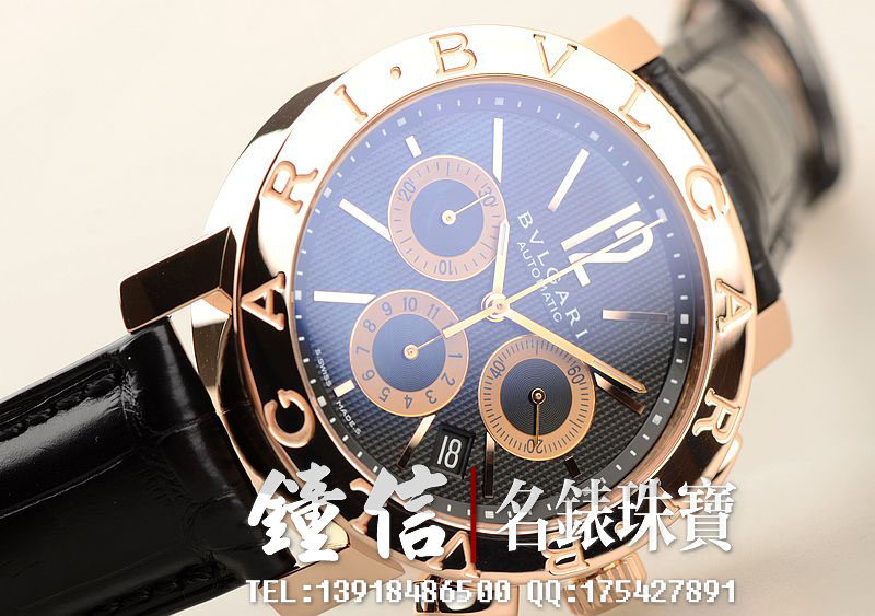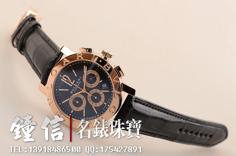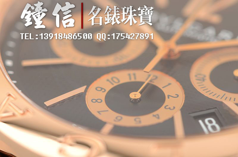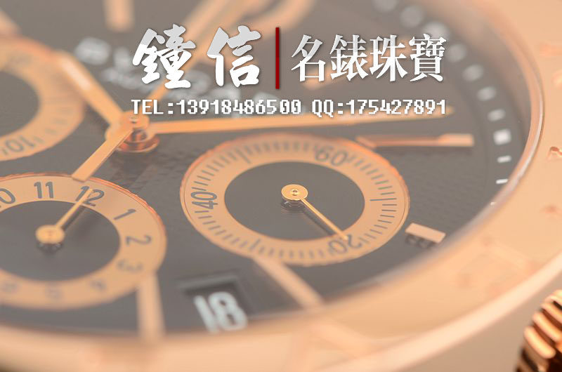 18K玫瑰金表壳及折叠式表扣,圣伯纳狗头印记。后配全新黑色鳄鱼皮表带。蓝宝石水晶镜面,立体黑色计时表盘,玫瑰金指针及刻度,9点位30分钟计时,6点位12小时计时,3点位独立小秒针,4点位日历显示功能。口径42MM*11.7MM。是该系列的大号尺寸。防水30M。