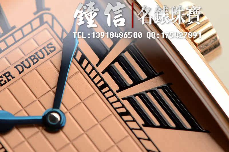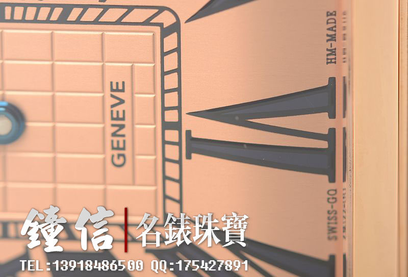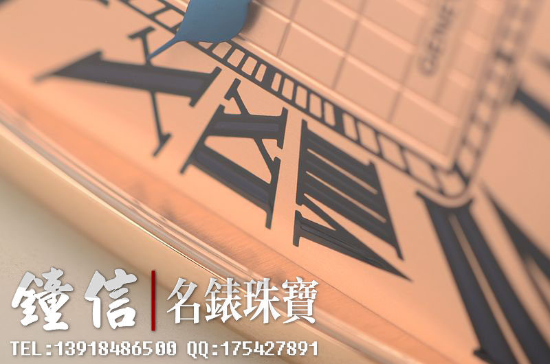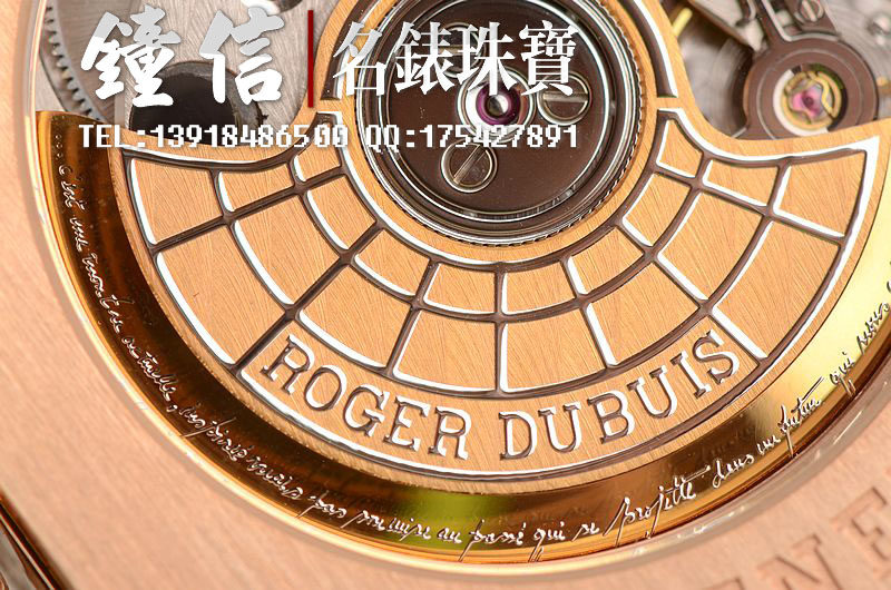 玫瑰金镌刻自动转陀,底部有一串用目镜方能看清的法文手书体,