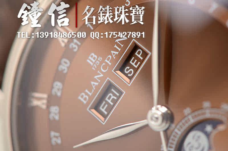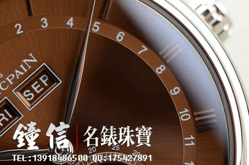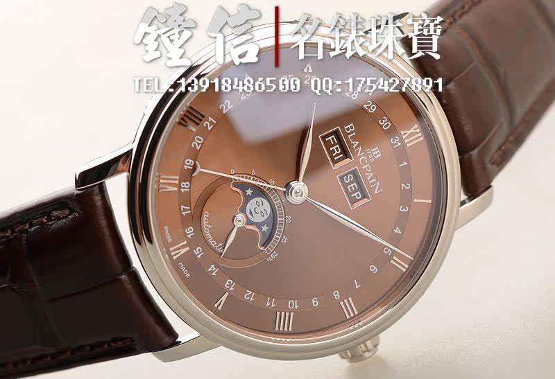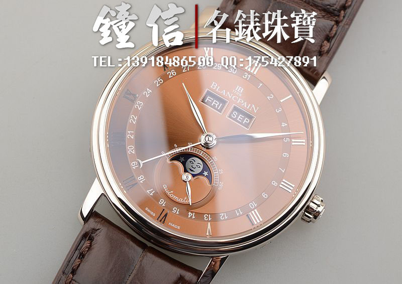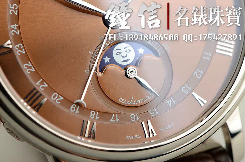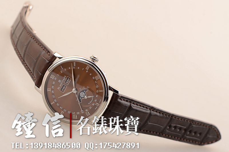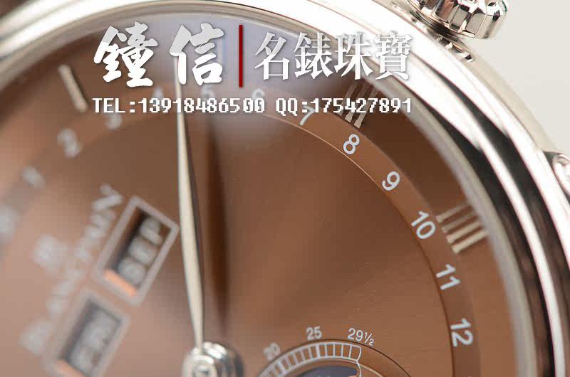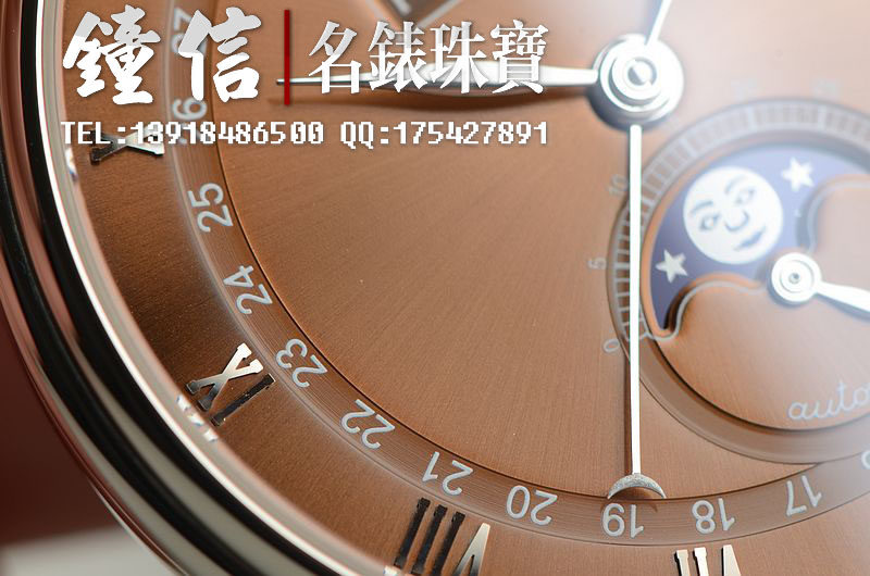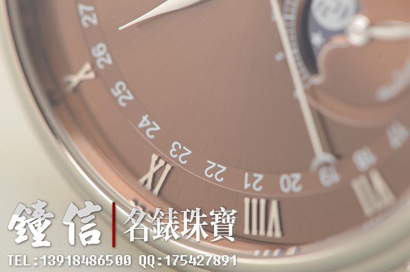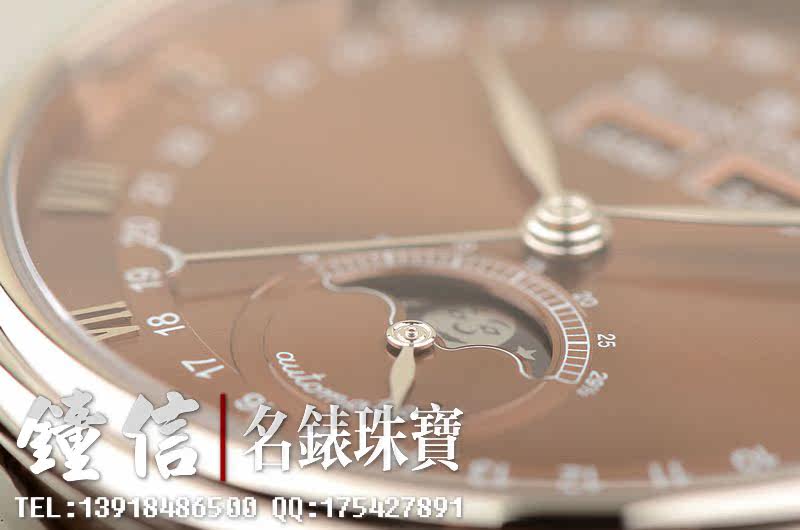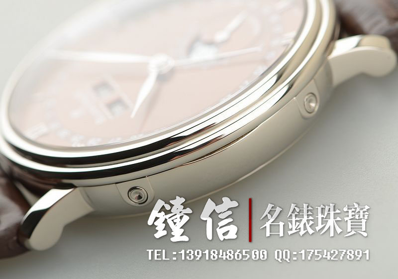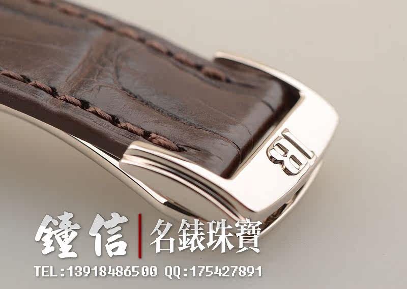 18K白金表壳及折叠式表扣,圣伯纳狗头印记。后配全新棕色鳄鱼皮表带。蓝宝石水晶镜面及底盖,立体咖啡色表盘,白金刻度及指针。全历,月相功能。口径38MM*10.7MM。防水30M。