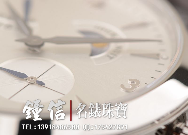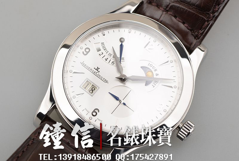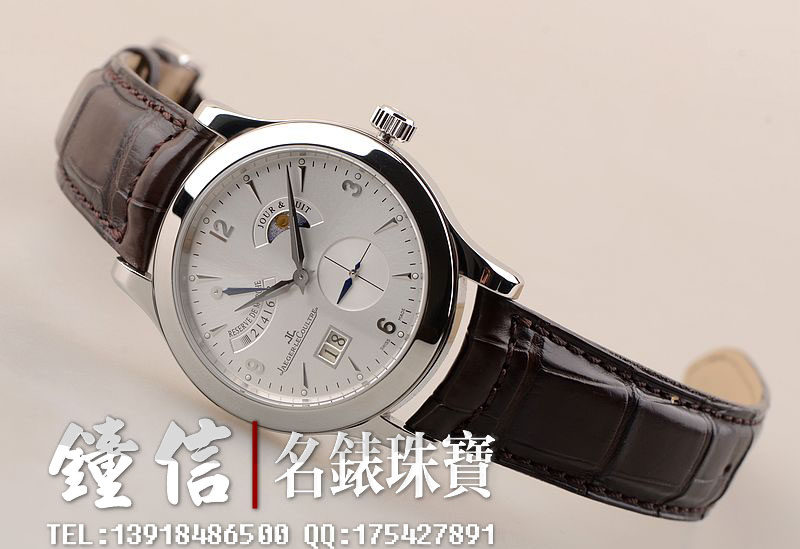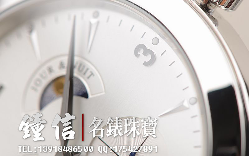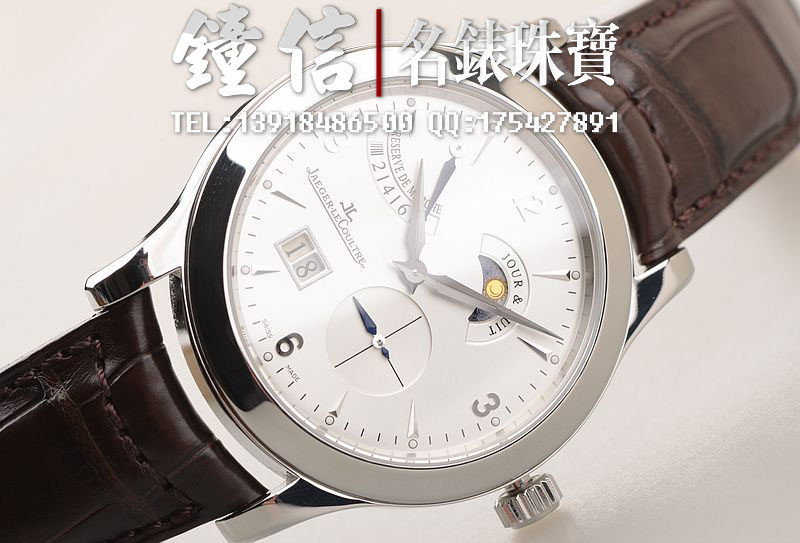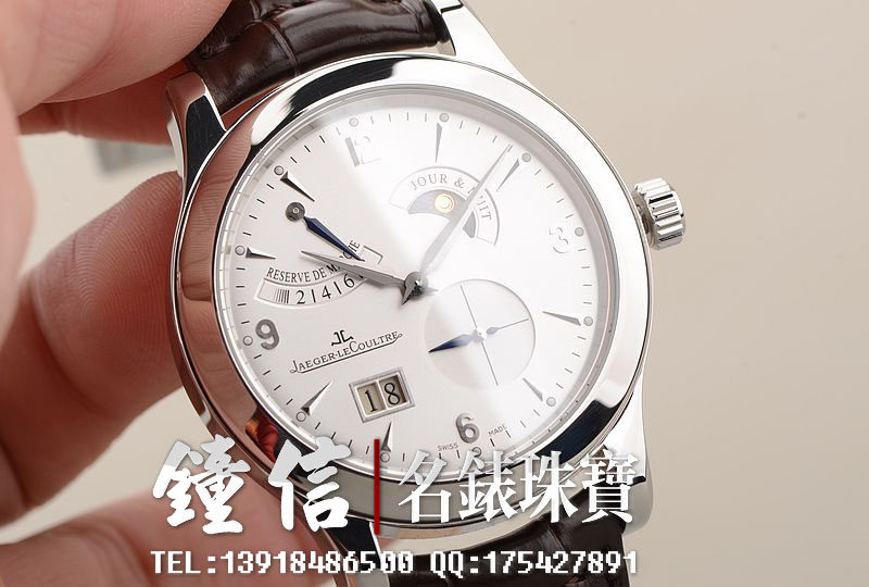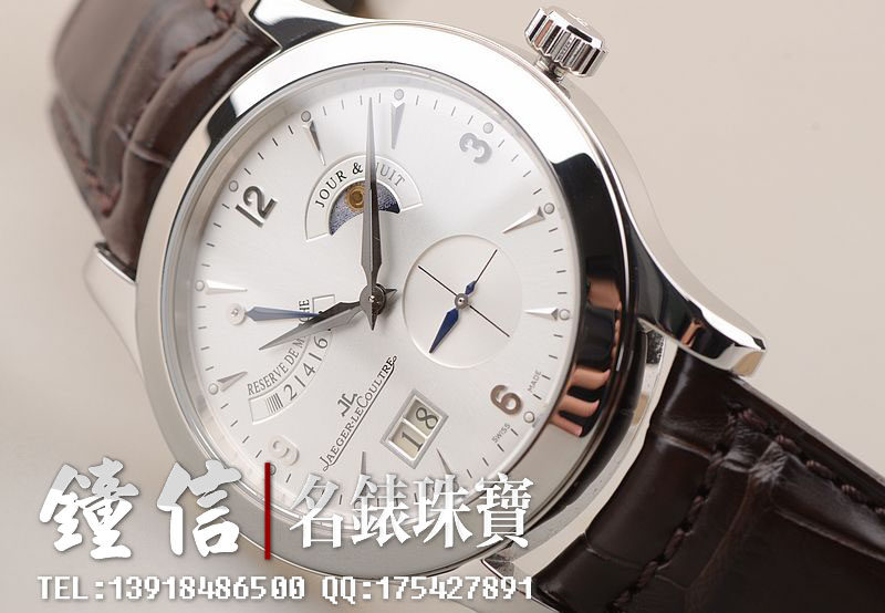 精钢表壳及折叠式表扣,后配棕色鳄鱼皮表带成色很新。蓝宝石水晶镜面及底盖,立体银白色表盘,夜光刻度及时分针。2点位昼夜显示功能,5点位蓝钢独立小秒针,7点位大日历显示窗口,10点位指针式八天动能储备显示。口径41MM*11MM。防水50M。