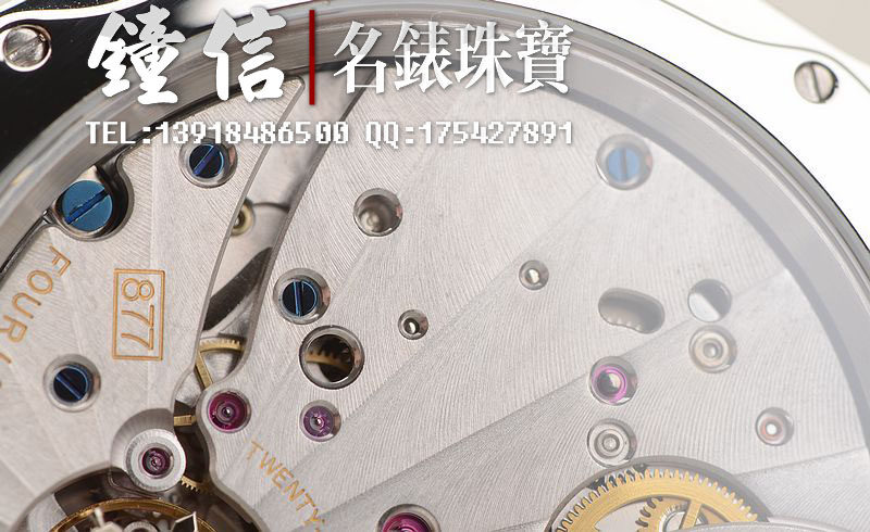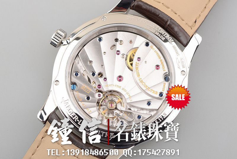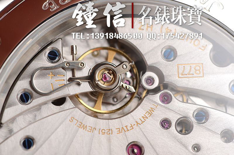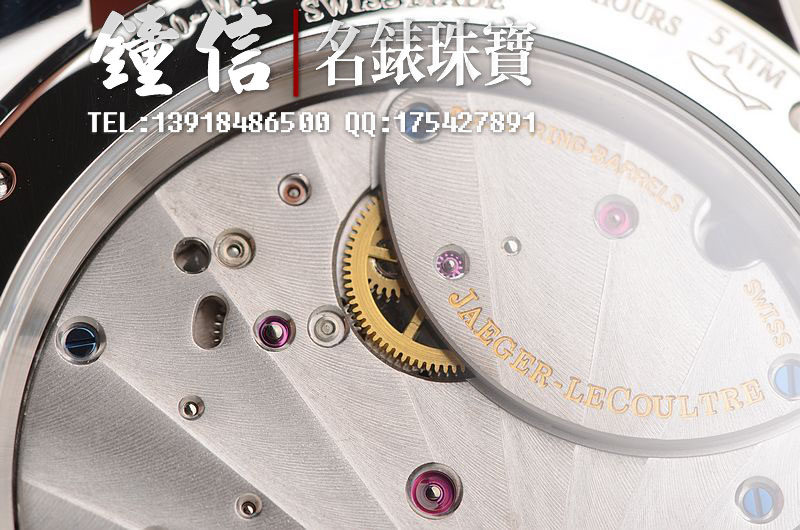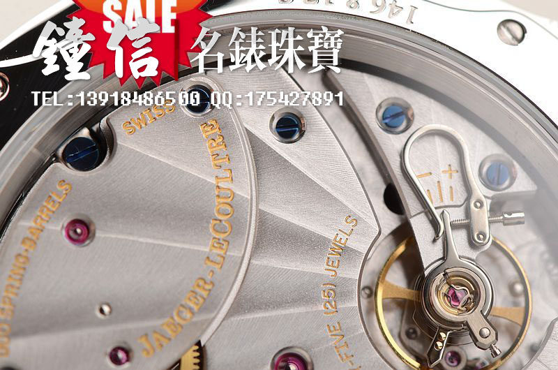 积家自产的CAL.877型机芯,手动机械,1000小时机芯测试标准。极其精致日内瓦条纹打磨,倒角抛光修饰,鹅颈微调。由217个零件组成,25钻,摆频28800,动力储备约192小时(8天链),走时状态极佳。