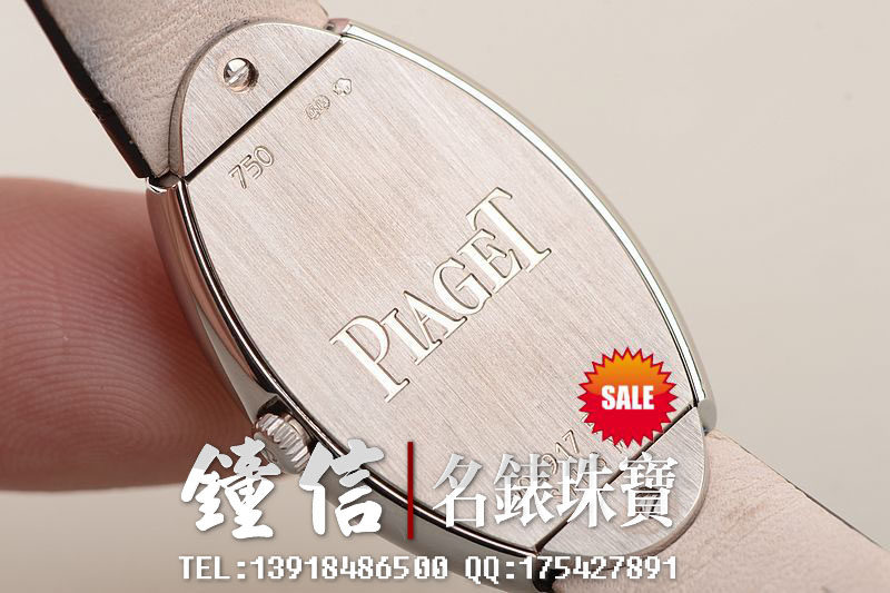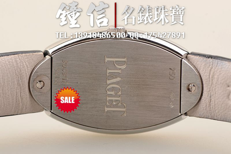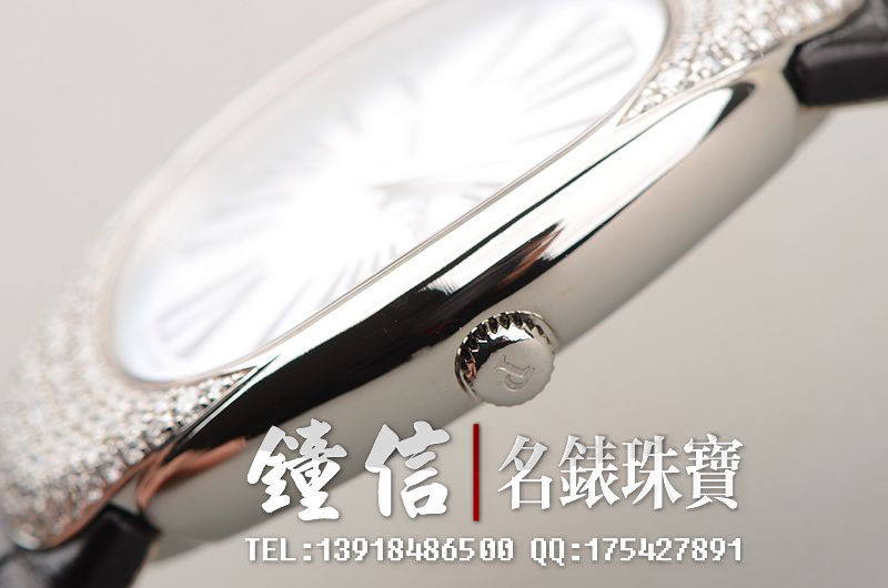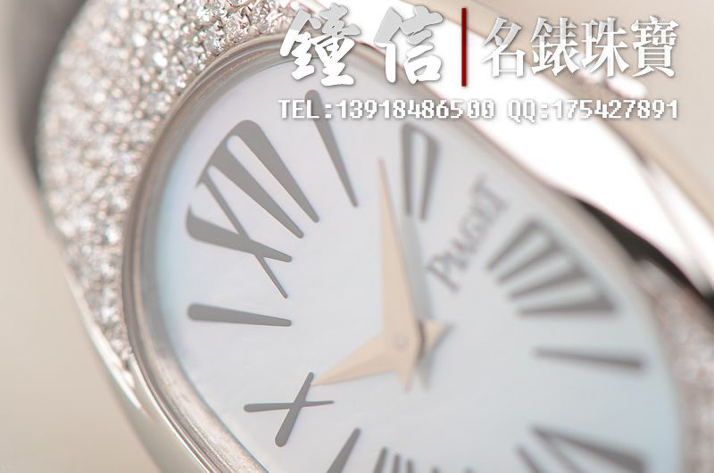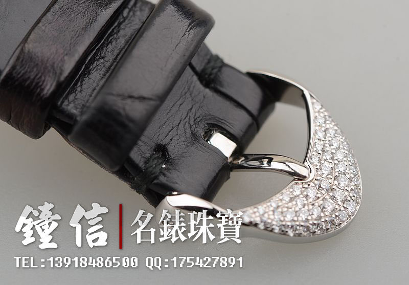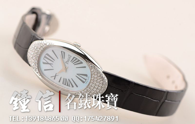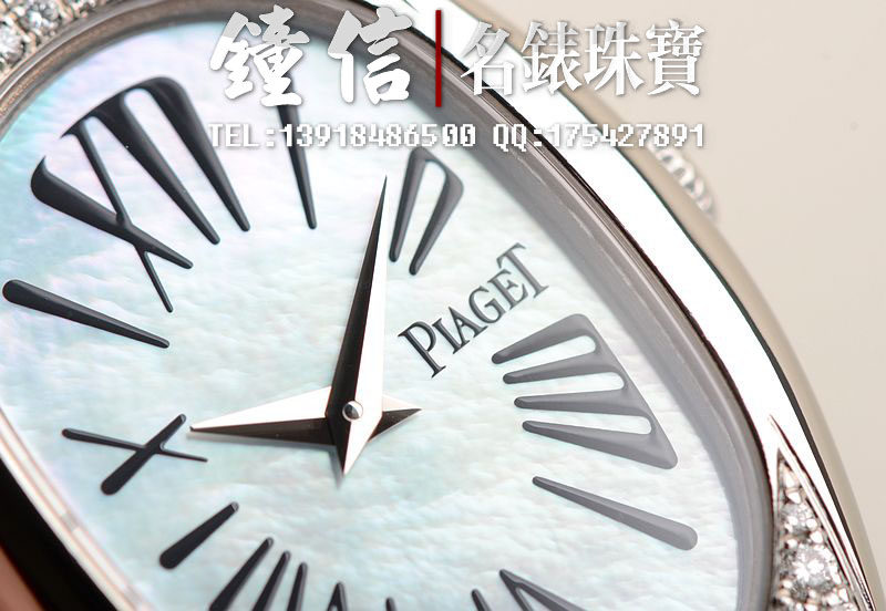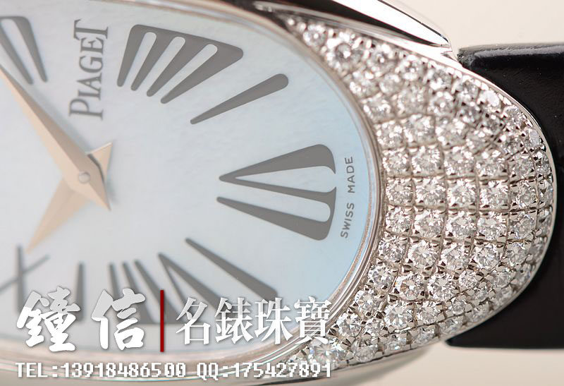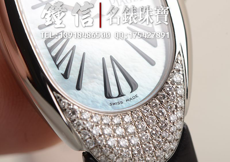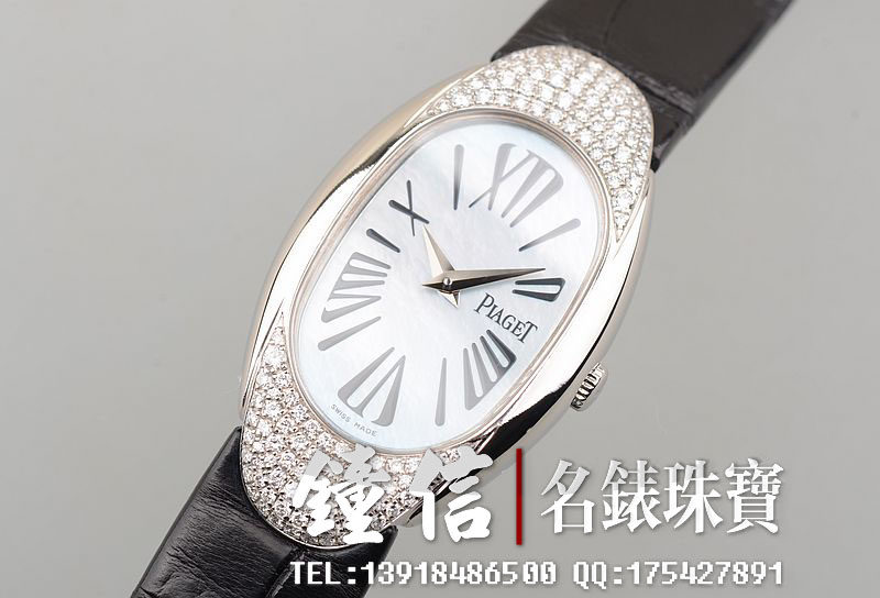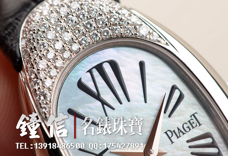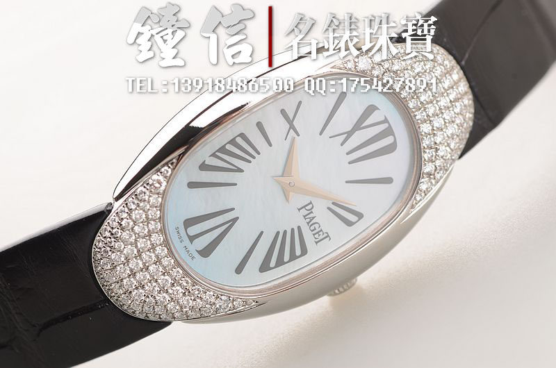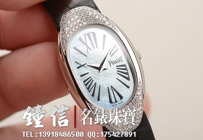 18K白金鹅蛋型镶钻表壳及镶钻表扣(全部原厂镶钻),圣伯纳狗头印记。原厂黑色鳄鱼皮表带成色极新。蓝宝石水晶镜面,立体蓝色珍珠贝母表盘,白金指针,黑色罗马字刻度。口径36.7MM*21.4MM*6.5MM,相当于圆表32MM左右大小。防水30M。