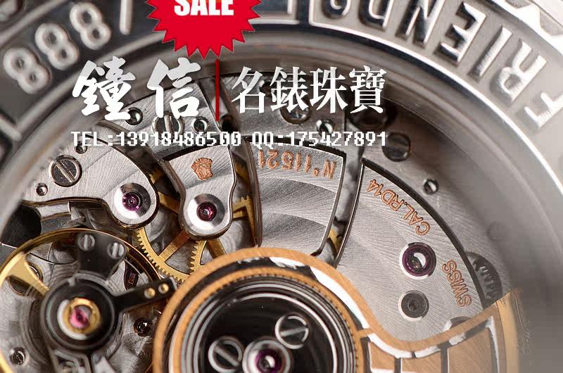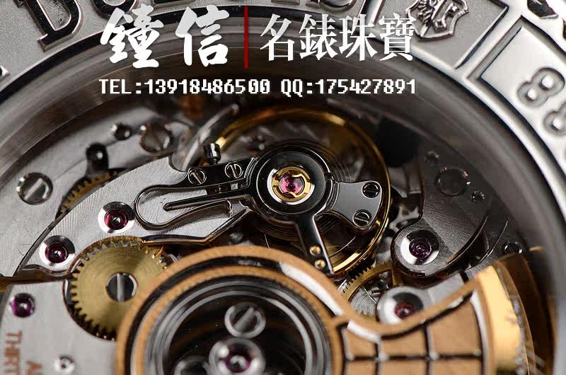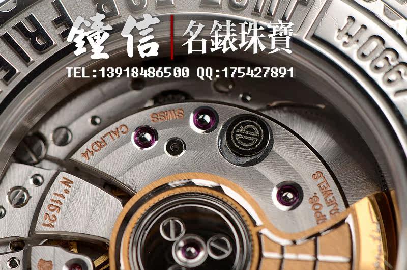 Roger Dubuis自产的CAL.RD14型机芯,自动机械,18K黄金与白金修饰自动摆陀,底部有一串用目镜也未必看的清楚的法文手书体。用钟咏麟先生的话说,ROGER DUBUIS玩工艺真算玩到极致了。日内瓦印记(值得一提的是,该品牌迄今所有腕表机芯均获得日内瓦印记证明,并附证书。这项殊荣在顶级品牌里都是很少见的。)机芯有独立签署,33钻,5方位校正。摆频28800,鹅颈微调,倒角抛光修饰。具备了一切顶级机芯的要素,走时状态极佳。