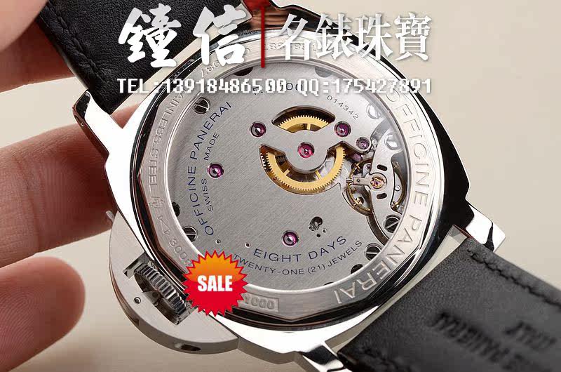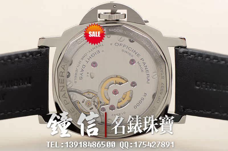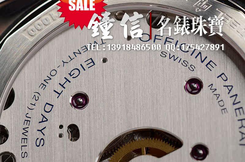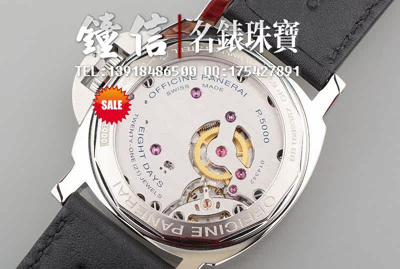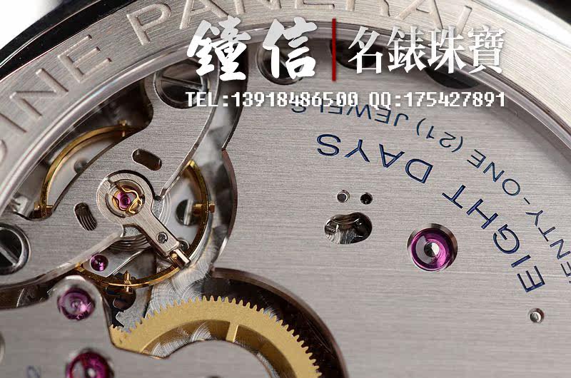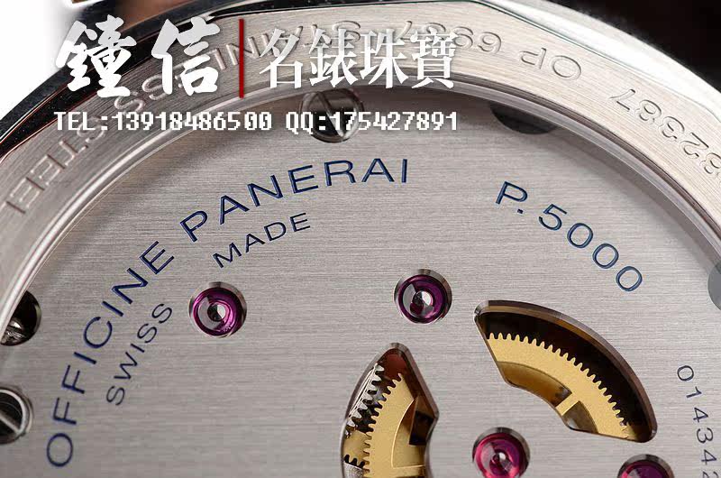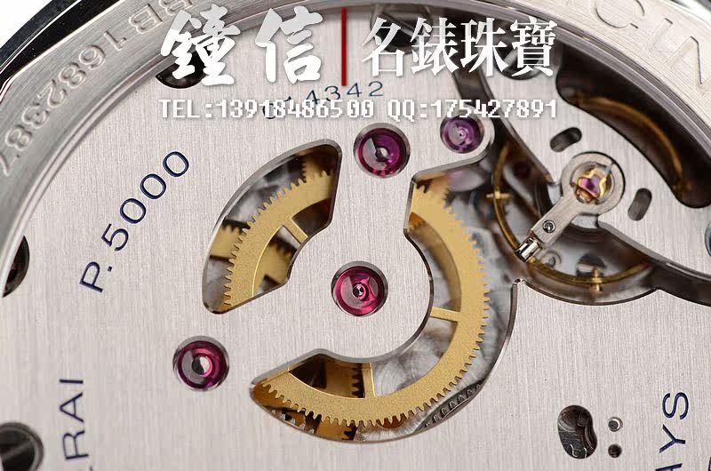 沛纳海自产的新型P.5000型机芯,手上链,由217个零件组成,精致日内瓦条纹打磨,21钻,摆频21600,双发条盒,提供八天长动力。走时状态极佳。