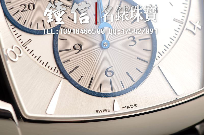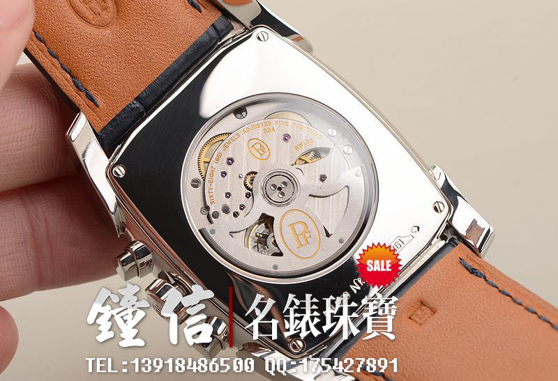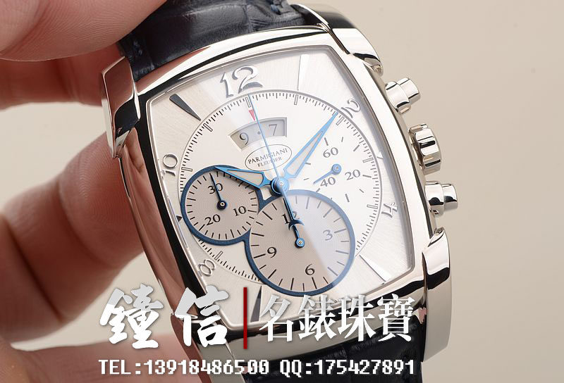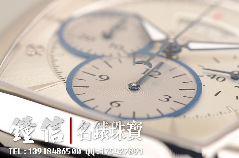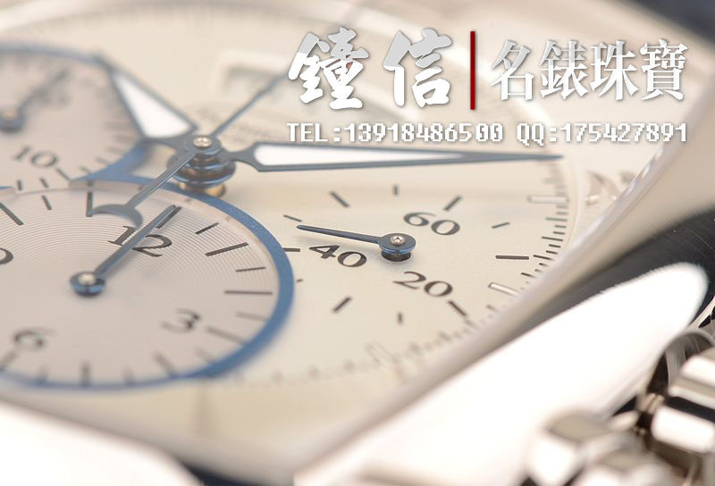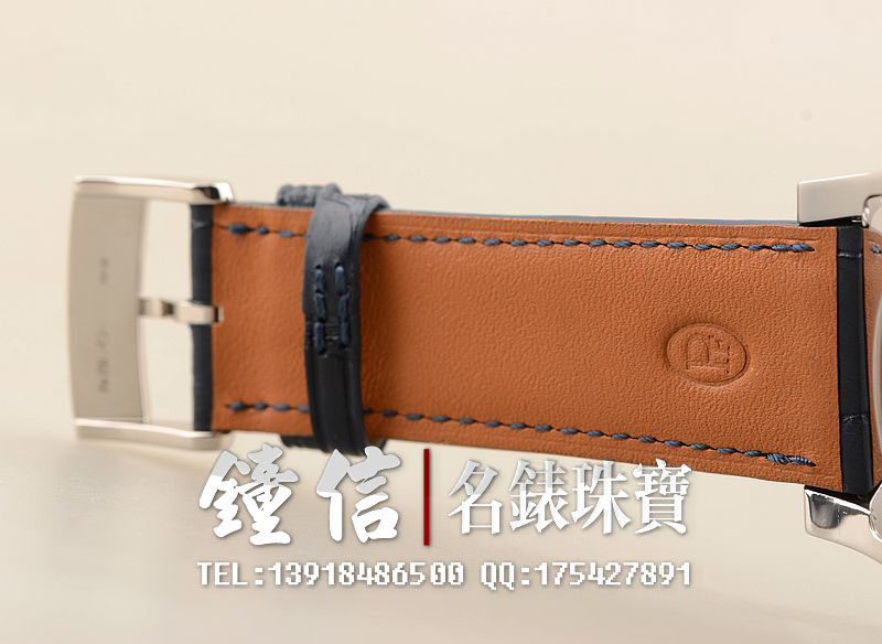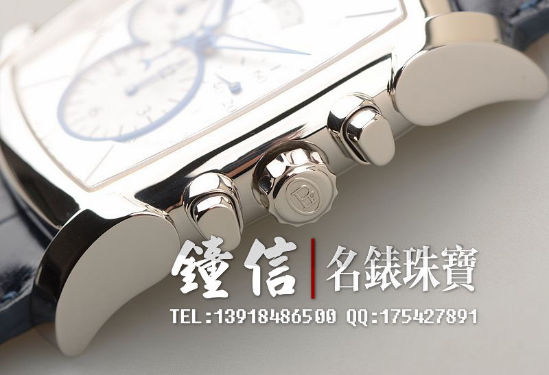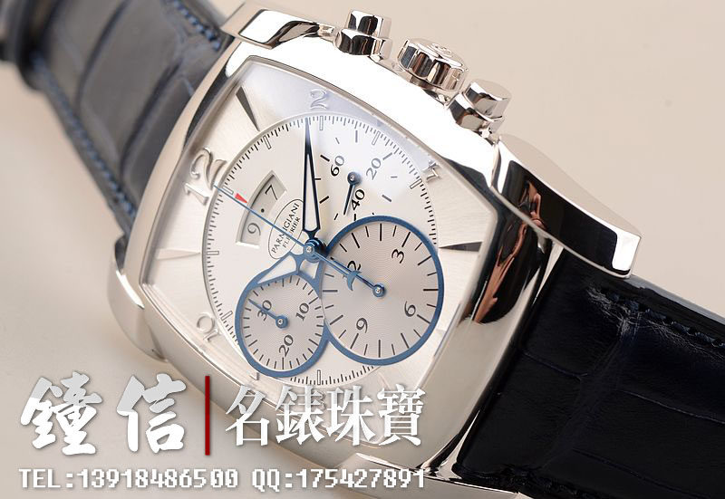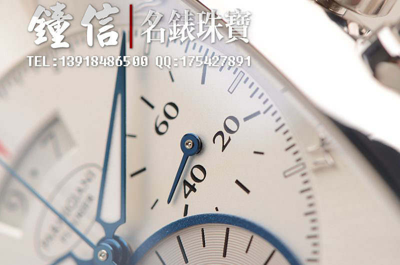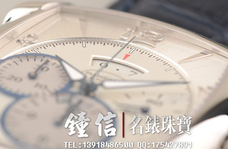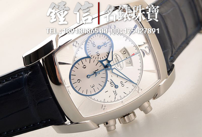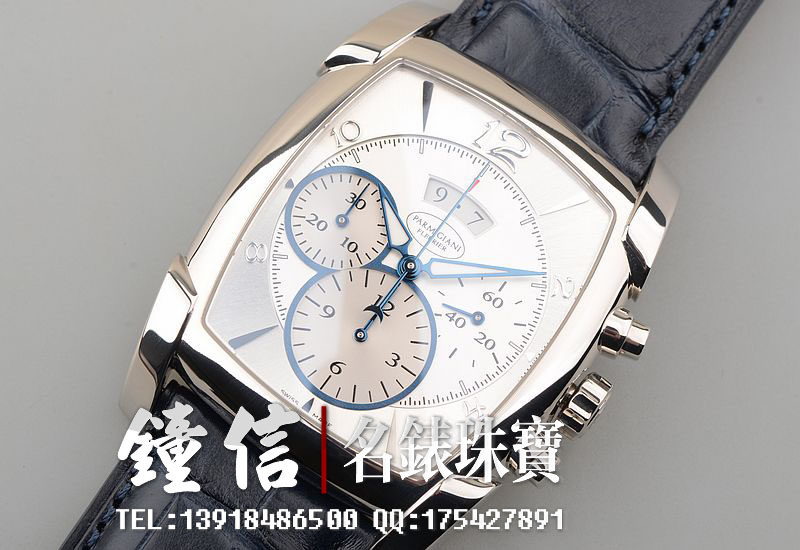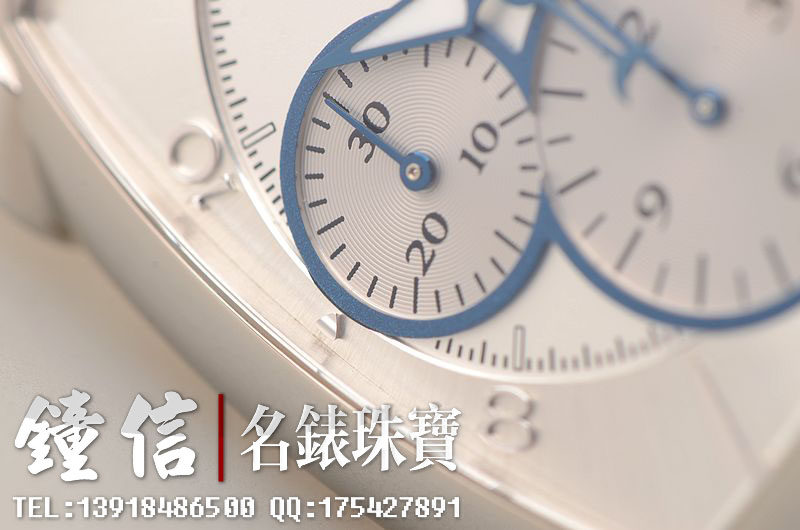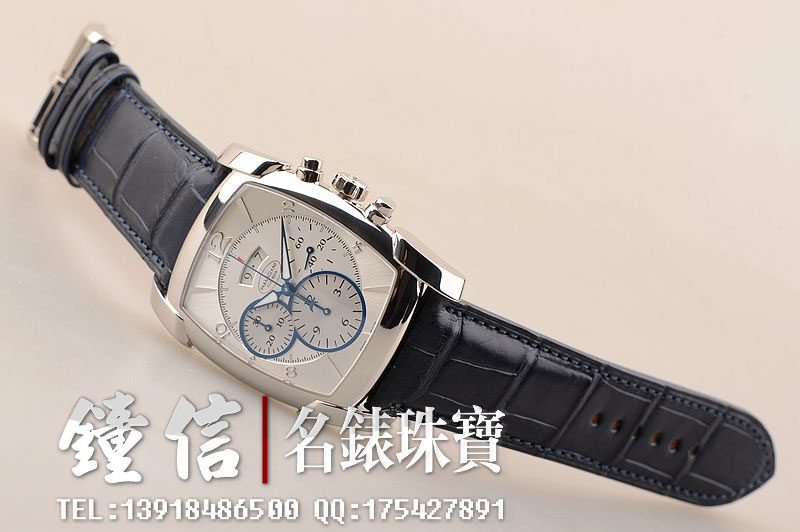 18K钯金表壳及表扣,圣伯纳狗头印记。后配全新深蓝色鳄鱼皮表带。蓝宝石水晶镜面及底盖,立体银白色计时表盘,蓝钢指针,12点位大日历视窗显示,9点位30分钟计时,6点位12小时计时。口径53MM*37MM*12.9MM,相当于圆表43MM左右大小。防水30M。