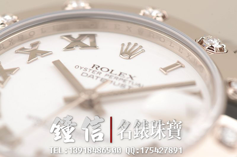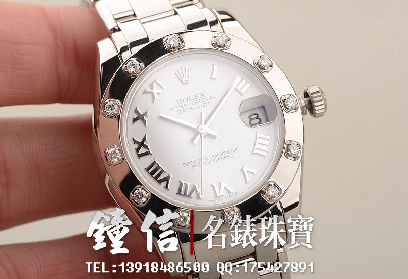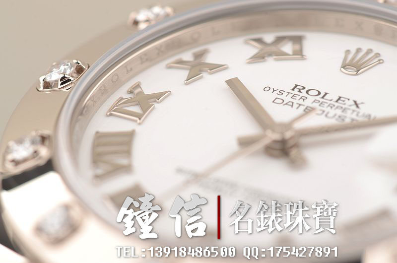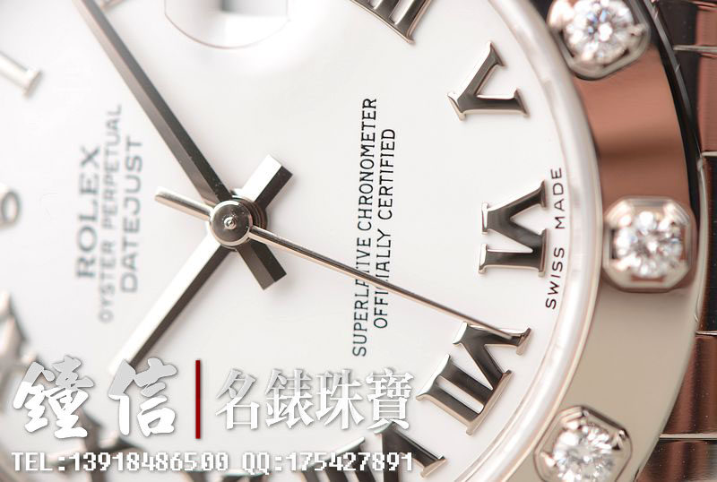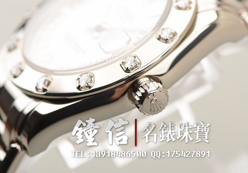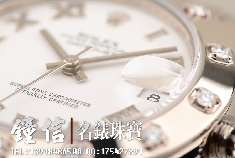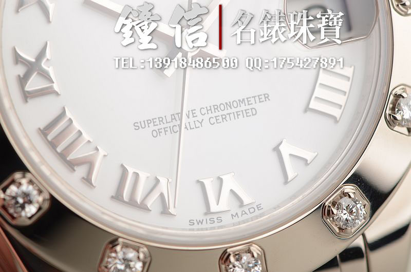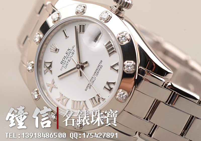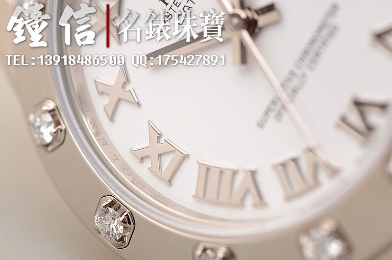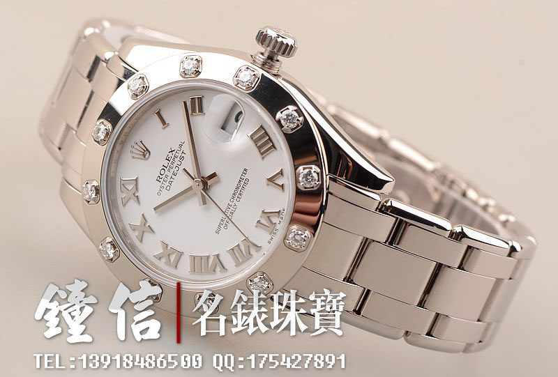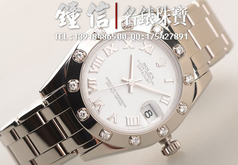 18K白金表壳及链带,折叠式表扣。圣伯纳狗头印记。蓝宝石水晶镜面,表圈镶嵌12颗原厂天然美钻。立体白色表盘,白金指针及刻度,3点位放大镜日历显示功能。旋入式防水表冠。口径34MM*11MM。防水100M。