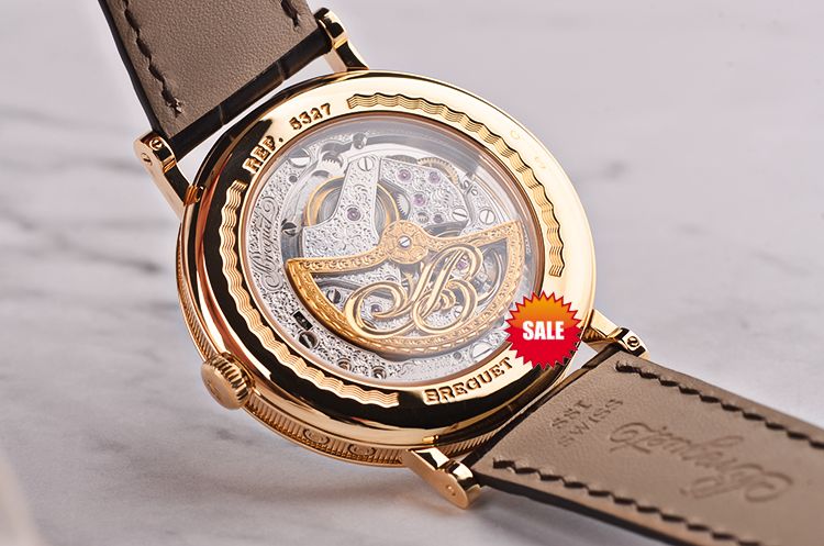 18K黄金钱币纹表壳及折叠式表扣,圣伯纳狗头印记。后配全新深棕色鳄鱼皮表带。蓝宝石水晶镜面及底盖,立体白金镀银镌刻表盘,烧蓝钢宝玑指针,黑色罗马时标,万年历显示(9点位闰年识别,6点位指针式日历,4点位星期显示,表盘中央指针式月份显示),10至11点位间指针式动能储备显示,1至2点位间宝玑人脸月龄月相。口径39MM*9.05MM,防水30M。