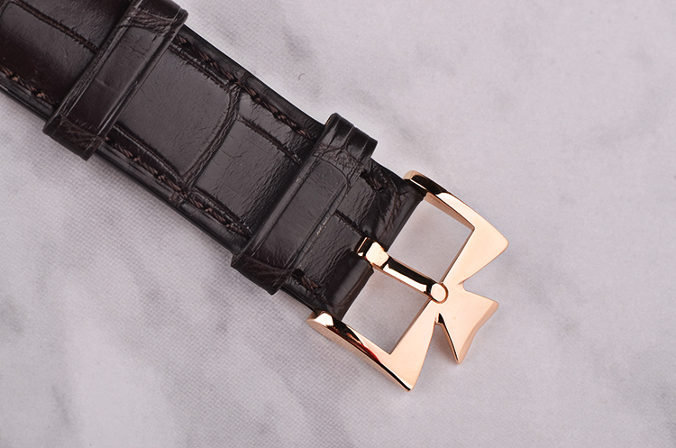 18K玫瑰金表壳及表扣,圣伯纳狗头印记。后配全新黑色鳄鱼皮表带。蓝宝石水晶镜面及底盖,立体银白色表盘,玫瑰金刻度及指针,小三针设计,3点位日历显示功能。口径38MM*8MM,防水30M。