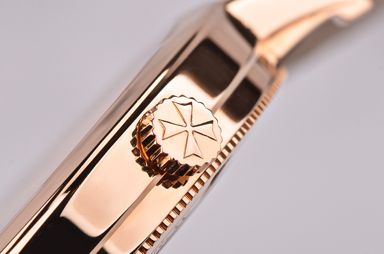 VC自产的CAL.2455型机芯,自动机械,极其精致日内瓦条纹打磨,倒角抛光修饰。日内瓦印记,由194个零件组成,27钻,摆频28800,5方位校正,动力储存约40小时。22K玫瑰金镌刻自动转陀,走时状态极嘉。