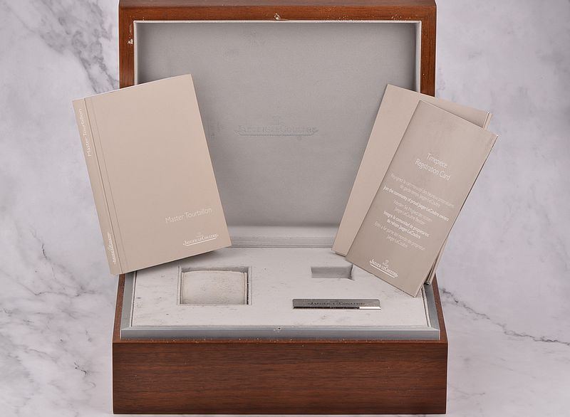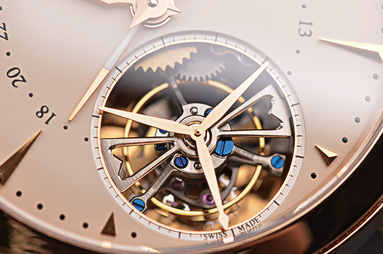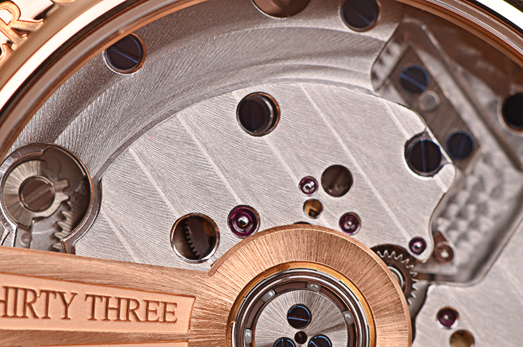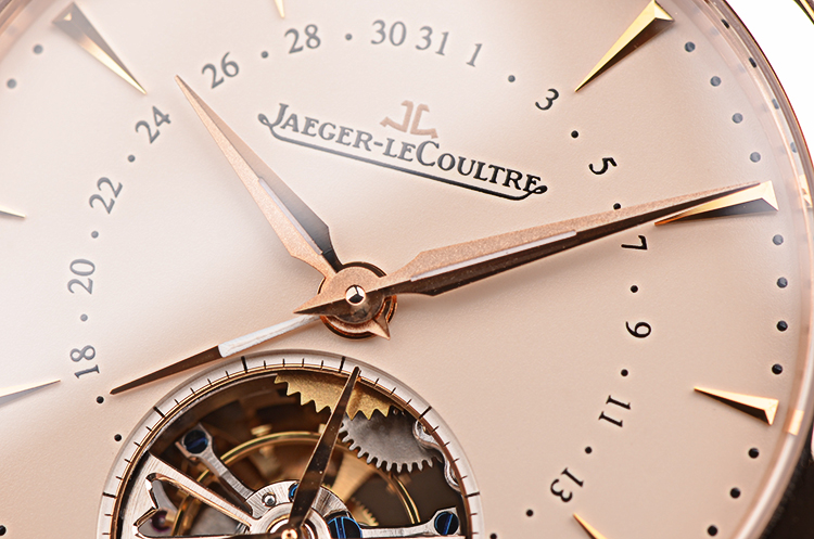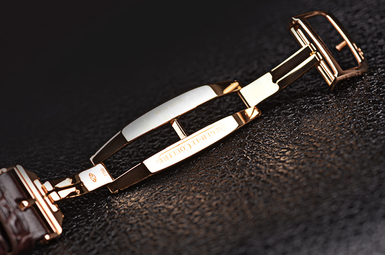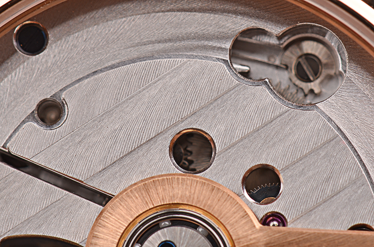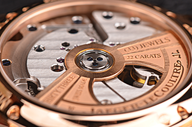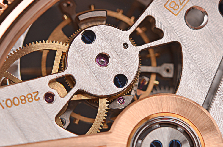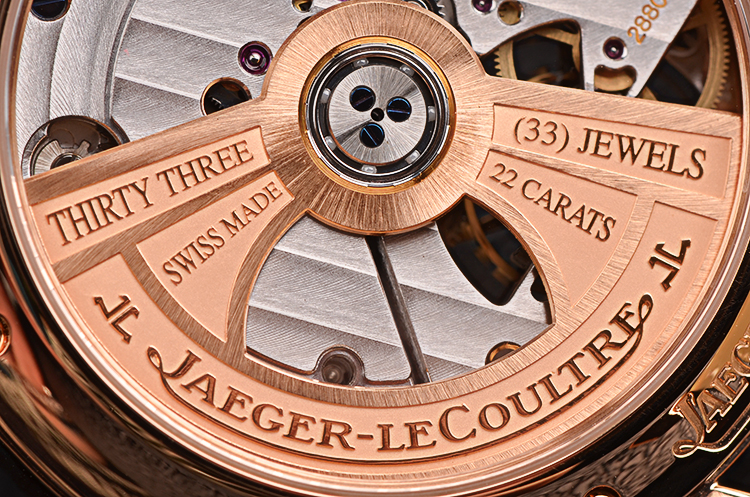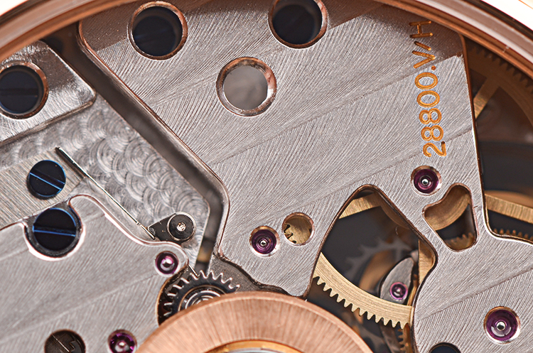 积家自产CAL.978型机芯,自动机械陀飞轮,极其精致日内瓦条纹打磨,倒角抛光修饰。由302个零件组成,33钻,摆频28800,22K玫瑰金镂空自动转陀,动力储存约48小时。走时状态极嘉。