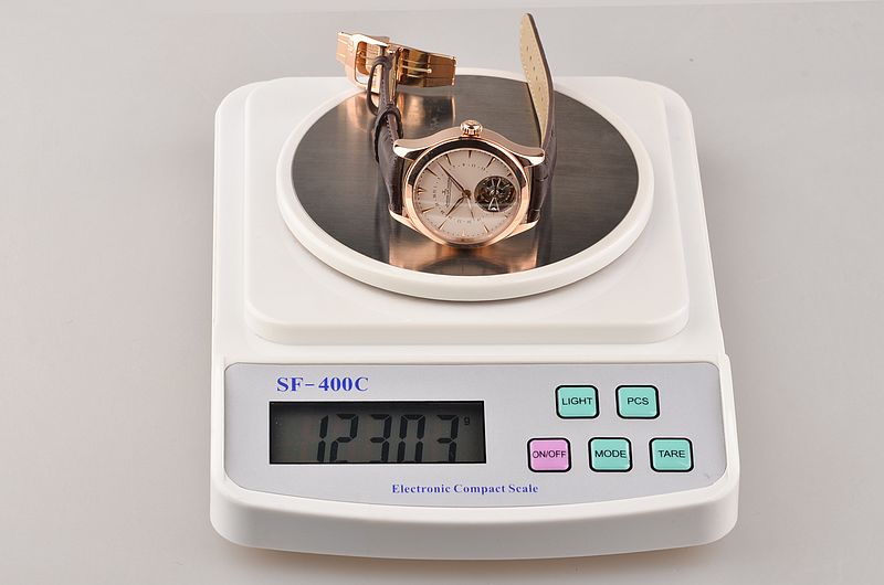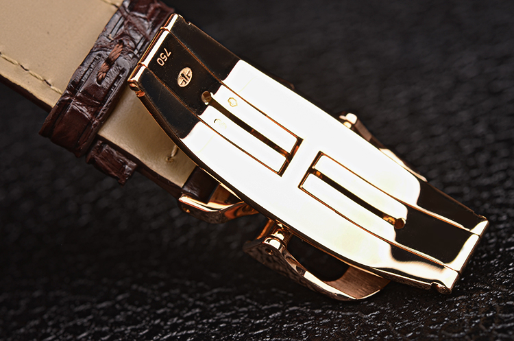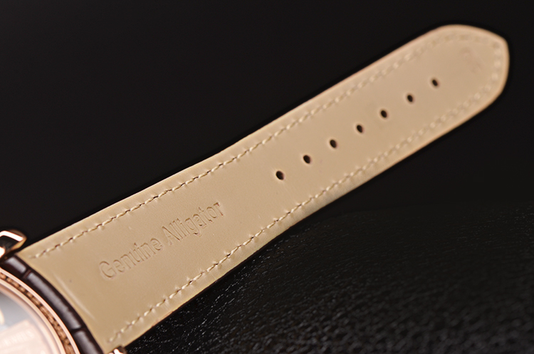 18K玫瑰金表壳及折叠式表扣,圣伯纳狗头印记。后配全新棕色鳄鱼皮表带。蓝宝石水晶镜面及底盖,立体米白色表盘,玫瑰金刻度及指针,指针式日历,6点位一分钟陀飞轮。口径39MM*12.9MM。防水50M。