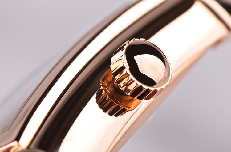 18K玫瑰金表壳及折叠式表扣,圣伯纳狗头印记。后配全新黑色鳄鱼皮表带。蓝宝石水晶镜面及底盖,立体黑色表盘,8颗天然美钻及玫瑰金罗马数字组成的时标,玫瑰金指针,罗马数字时标及时分针有夜光,口径40.5MM*26.5MM*9.9MM,相当于圆表34MM左右大小。防水30M。