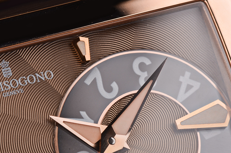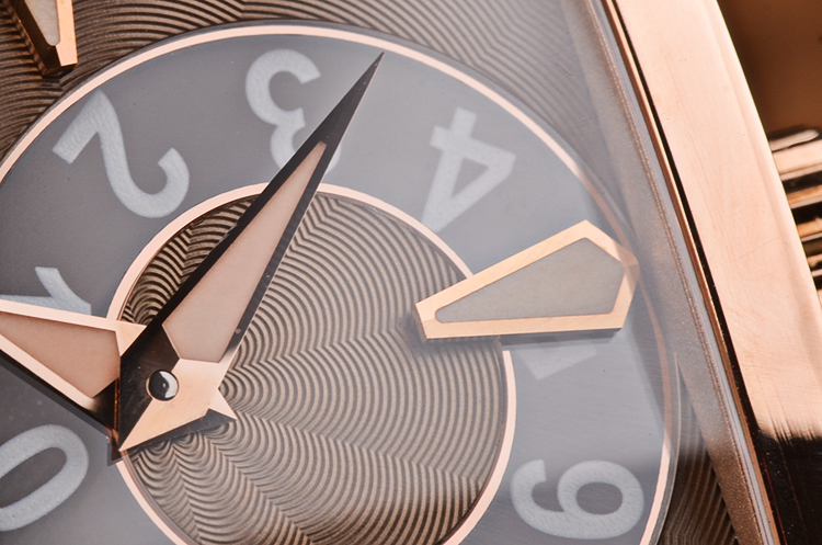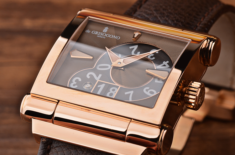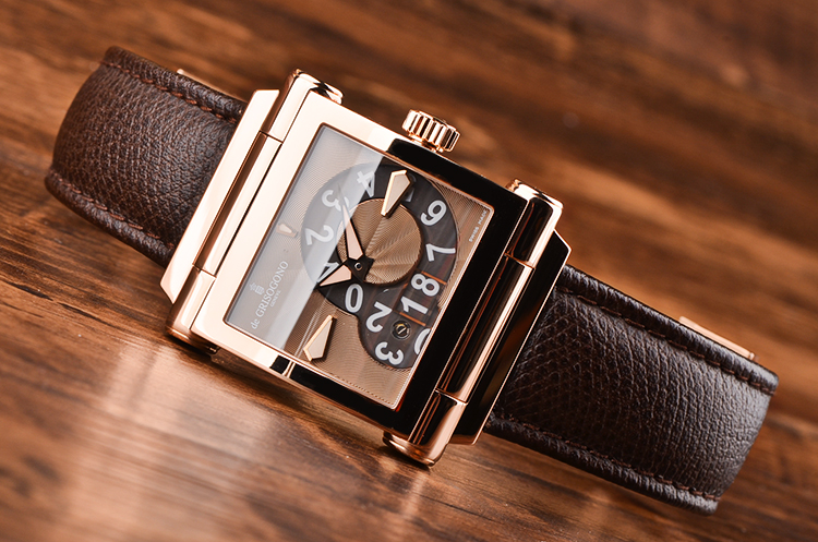 18K玫瑰金矩形表壳及按压式双向折叠表扣,圣伯纳狗头印记。原厂棕色小牛皮表带成色极新。蓝宝石水晶镜面及底盖,立体棕色太阳纹表盘。两个阿拉伯数字转盘组成的大日历窗口别具一格。玫瑰金夜光指针及刻度,表壳3点位侧透设计。口径47MM*36MM*12.3MM。相当于44MM圆表大小。防水30M。