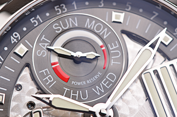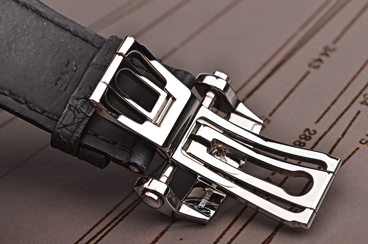 精钢表壳及按压式双向折叠表扣,原厂黑色短吻鳄鱼皮内衬橡胶表带成色极新。蓝宝石水晶镜面及底盖,立体黑色镂空表盘,夜光指针及刻度。12点位指针式动能储备及星期显示,6点位大日历窗口,月牙形指针式周历显示。表壳侧面2点位星期调校孔,10点位周历调校孔。旋入式防水表把。口径43.5MM*16.25MM。防水100M。