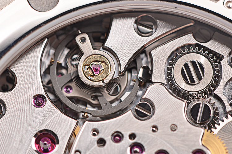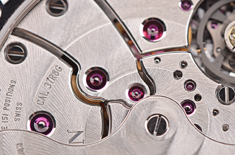 JB自产的Cal.37R8G型机芯,自动机械,极其精致日内瓦条纹打磨,倒角抛光修饰。由389个零件组成,3个发条盒,46钻,摆频28800,动力储存高达192小时,八天链。5方位校正。18K白金镌刻自动转陀。走时状态极嘉。