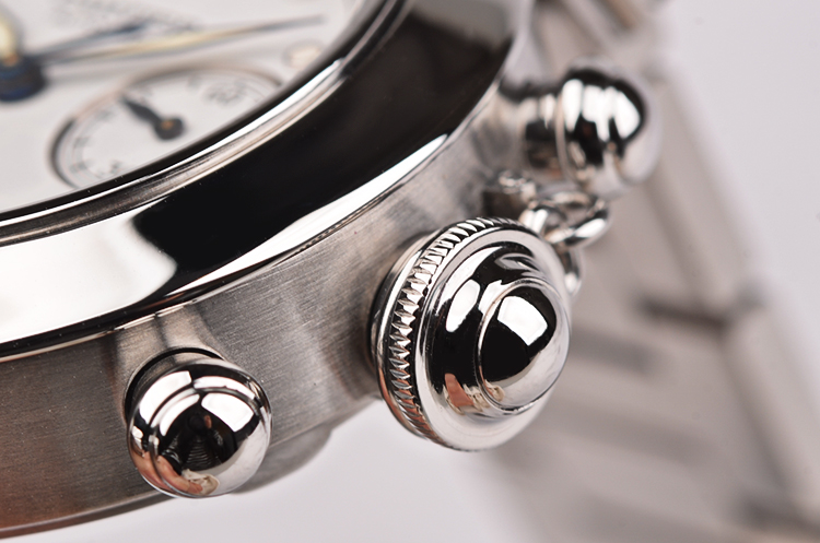 精钢表壳及链带,双向按压式折叠表扣,蓝宝石水晶镜面,立体白色表盘,夜光蓝钢指针及刻度,4点位日历显示功能。口径36MM*12MM,防水30M。