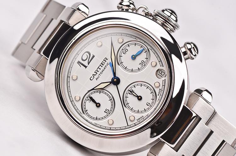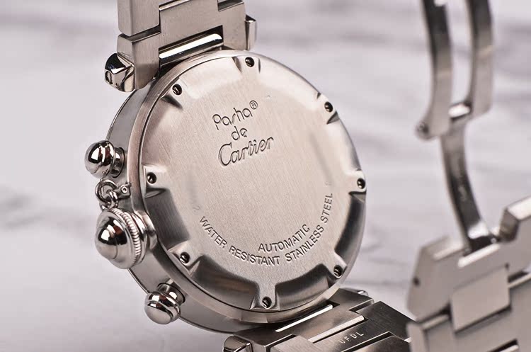 卡地亚自动机械机芯,计时及日历功能,精致日内瓦条纹打磨,摆频28800,动力储存约40小时,走时状态极嘉。