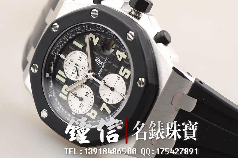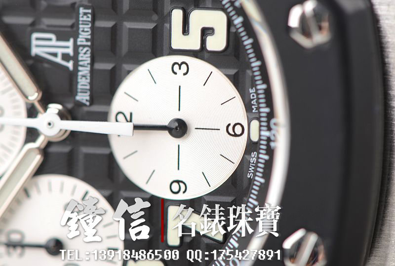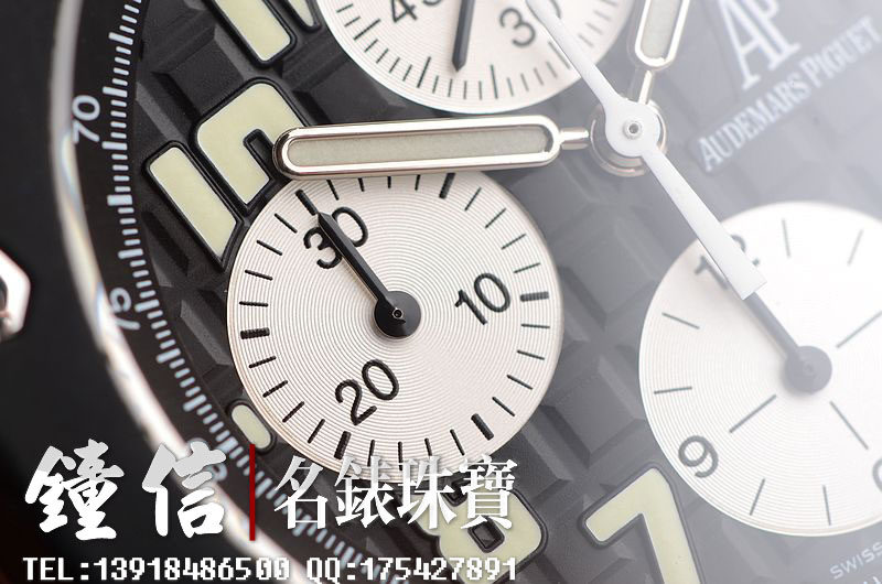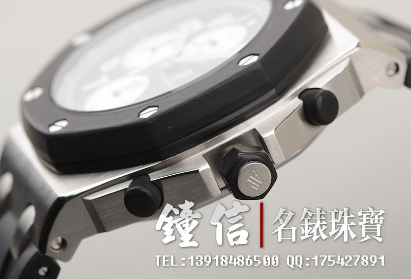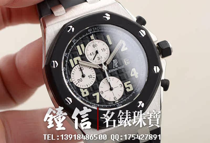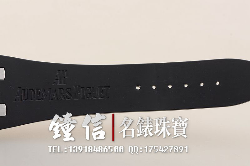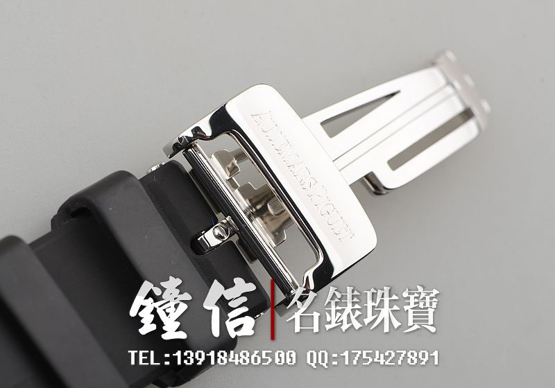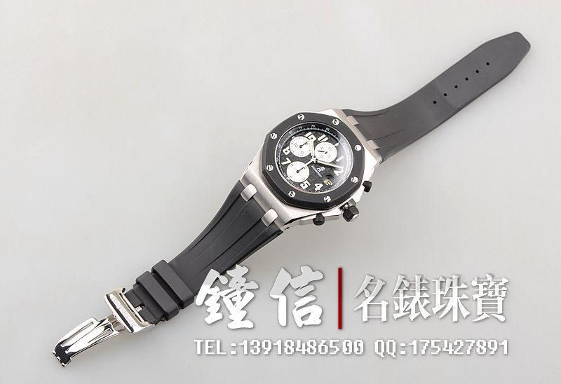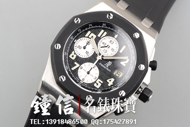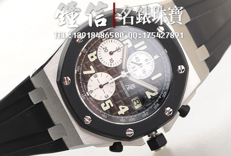 八角皇家橡树精钢表壳及折叠式表扣,黑色橡胶表圈,前后盖白金螺丝。原厂黑色橡胶表带成色很新。蓝宝石水晶镜面,立体黑白双色华夫格计时表盘,夜光指针及刻度。12点位独立小秒针,9点位30分钟计时,6点位12小时计时,3点位放大镜日历视窗。旋入式防水锁把。口径42MM*54MM*14.5MM。相当于圆表44MM左右大小。防水100M。