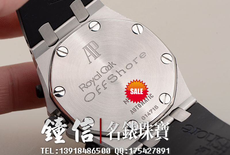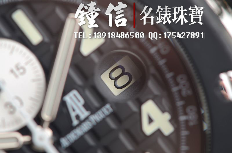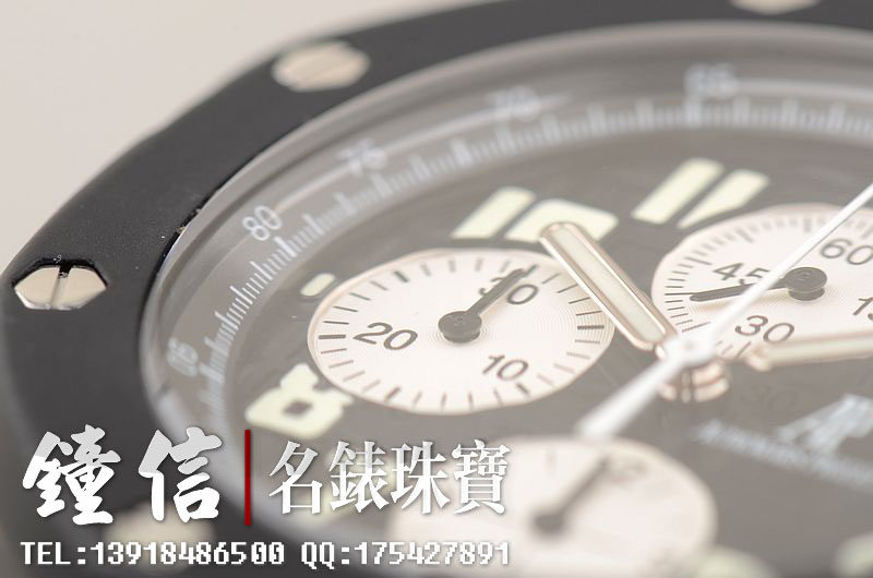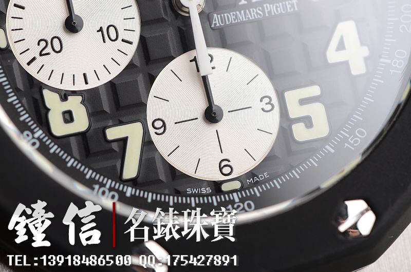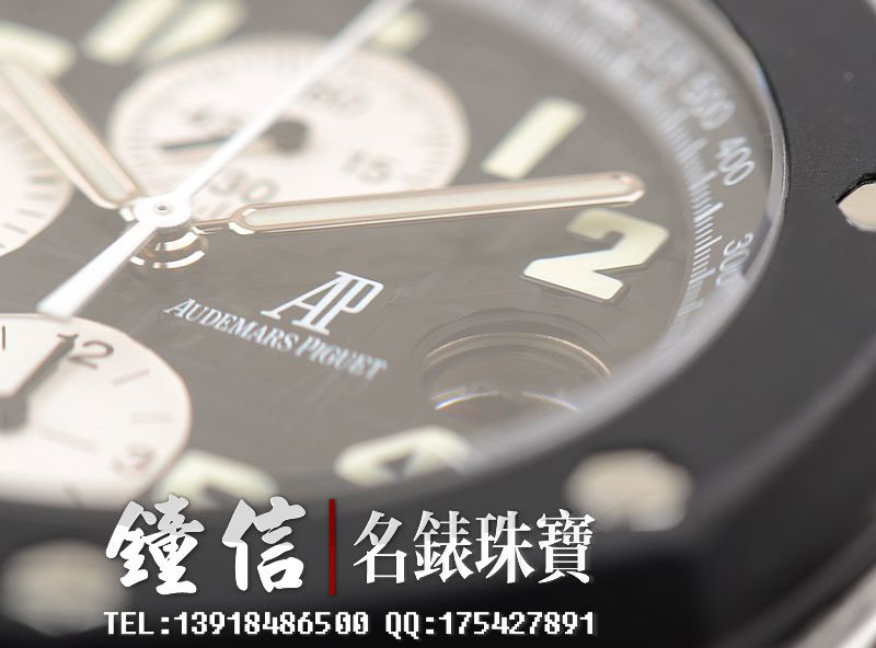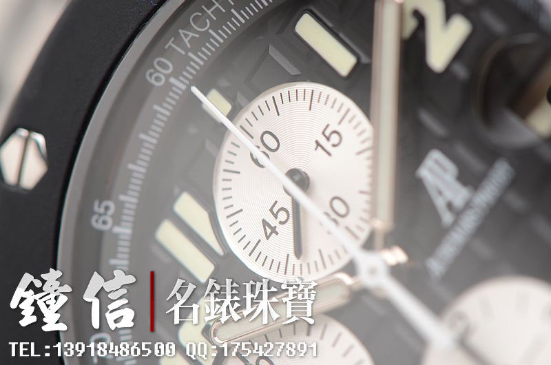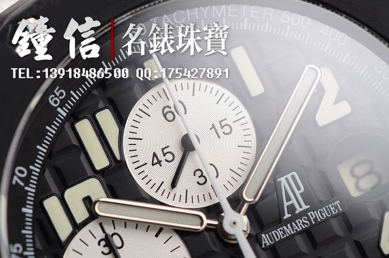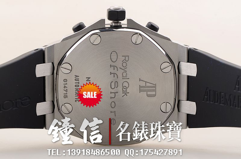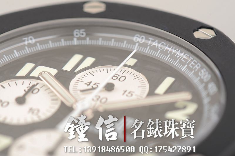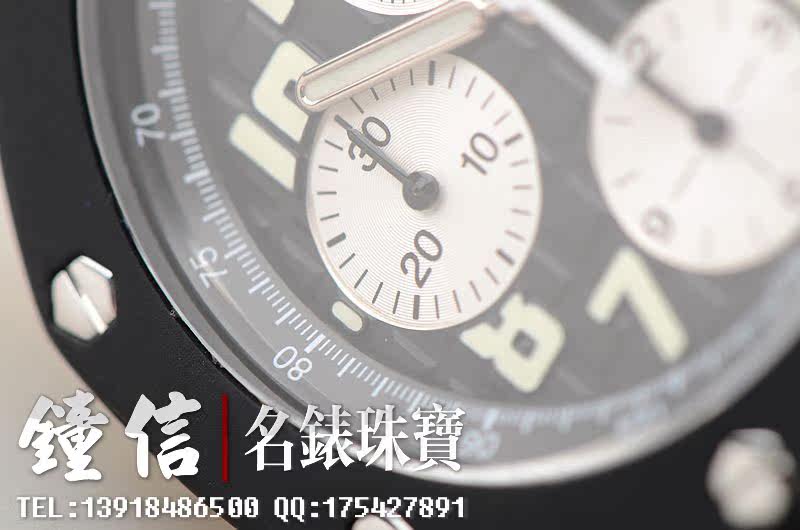 八角皇家橡树精钢表壳及折叠式表扣,黑色橡胶表圈,前后盖白金螺丝。原厂黑色橡胶表带成色很新。蓝宝石水晶镜面,立体黑白双色华夫格计时表盘,夜光指针及刻度。12点位独立小秒针,9点位30分钟计时,6点位12小时计时,3点位放大镜日历视窗。旋入式防水锁把。口径42MM*54MM*14.5MM。相当于圆表44MM左右大小。防水100M。