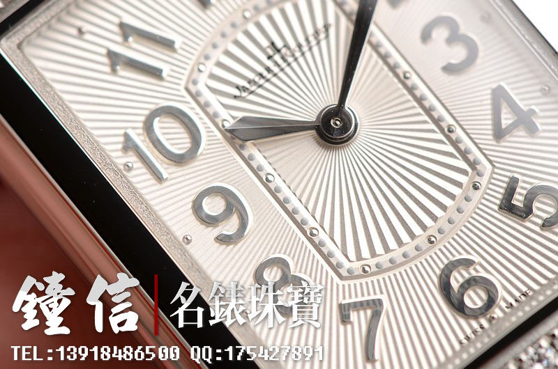 精钢表壳及折叠式表扣,原装黑色鳄鱼皮表带成色极新。蓝宝石水晶镜面,表框镶嵌两排原厂天然美钻,30颗,约0.42克拉。立体银色扭索纹表盘,镀铑数字,口径40MM*24MM*7.1MM,相当于圆表33MM左右大小。防水30M。