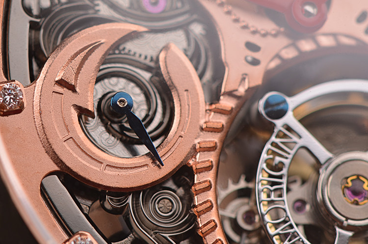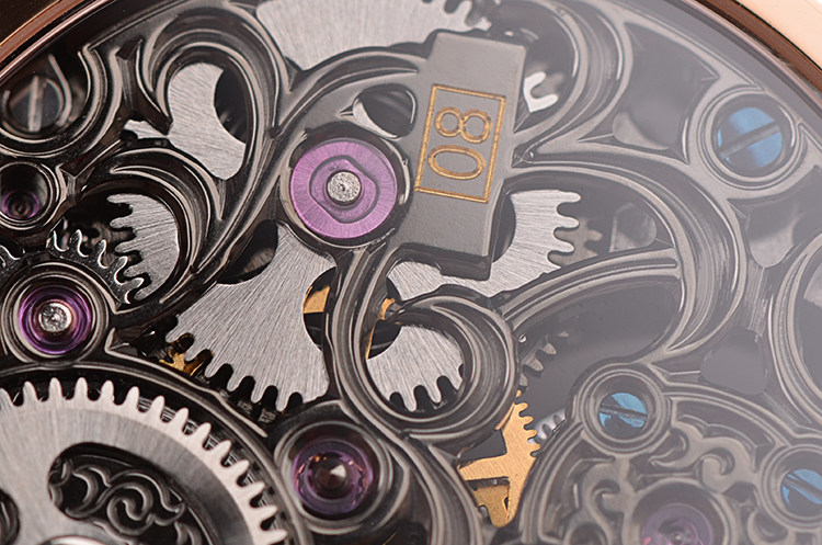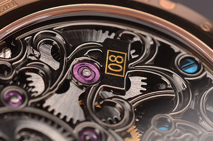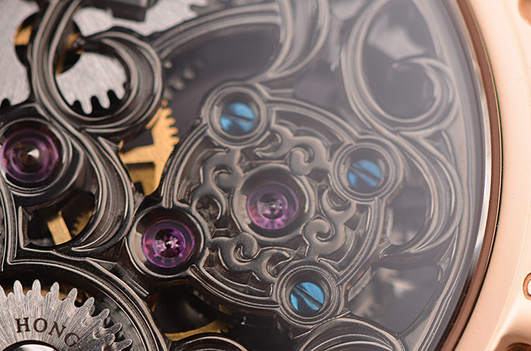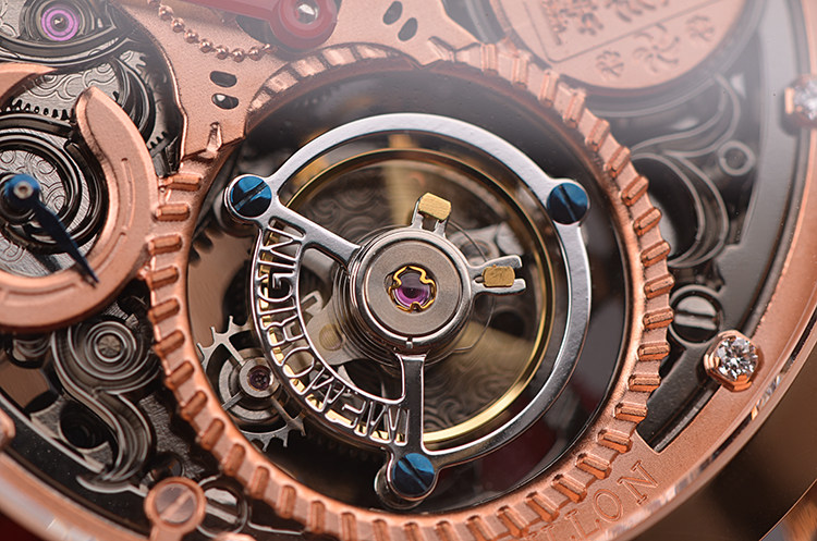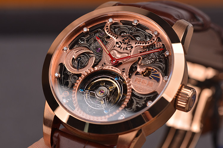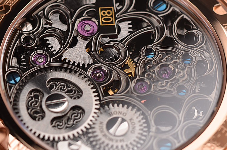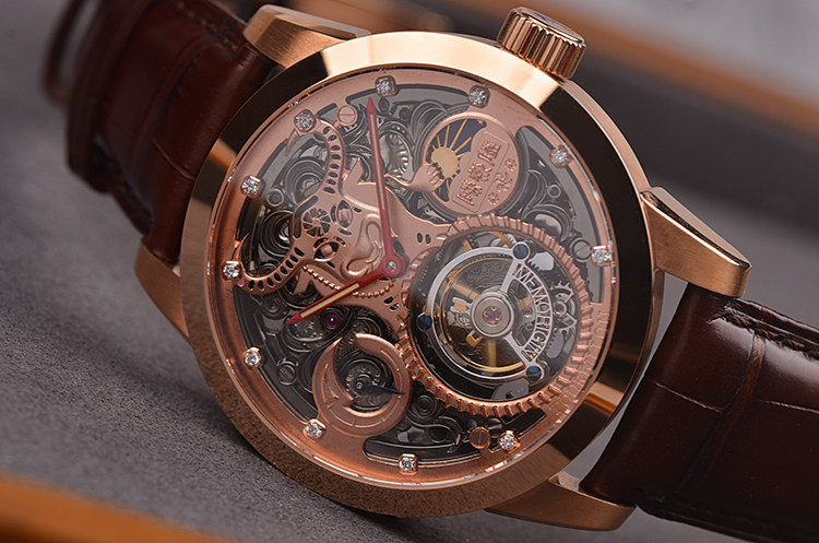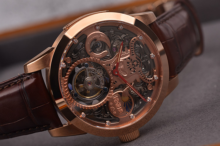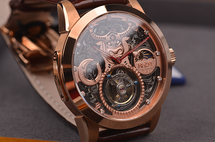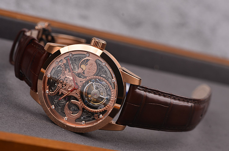 机芯:手动机械,万希泉自产雕花陀飞轮机芯,80小时动力储备,双发条盒,