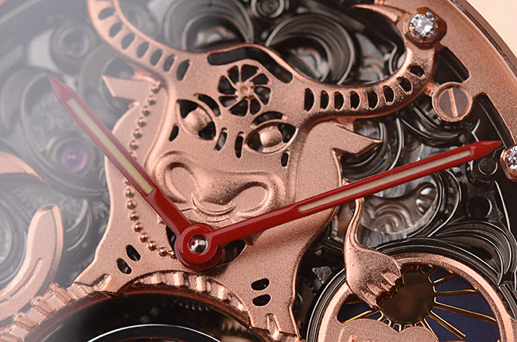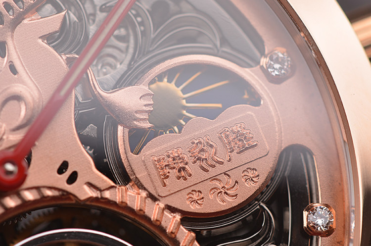 表盘:镂空设计面盘,小秒针,陀飞轮,12时牛剪纸造型浮雕,11颗钻石作时间刻度,9点位动力储存显示。