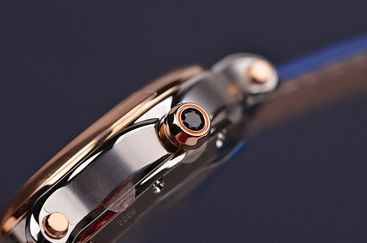 表壳:精钢表壳,玫瑰金表圈,精钢表扣