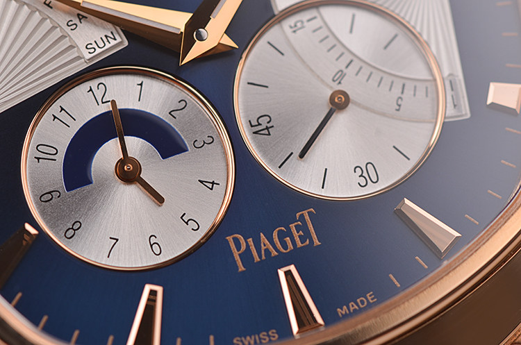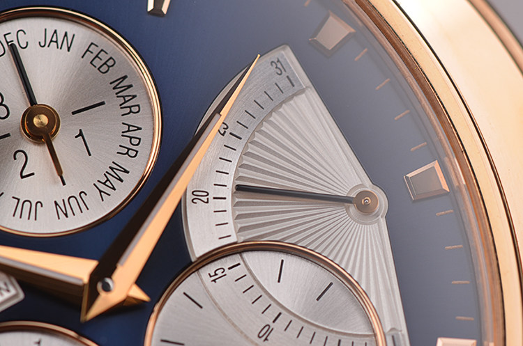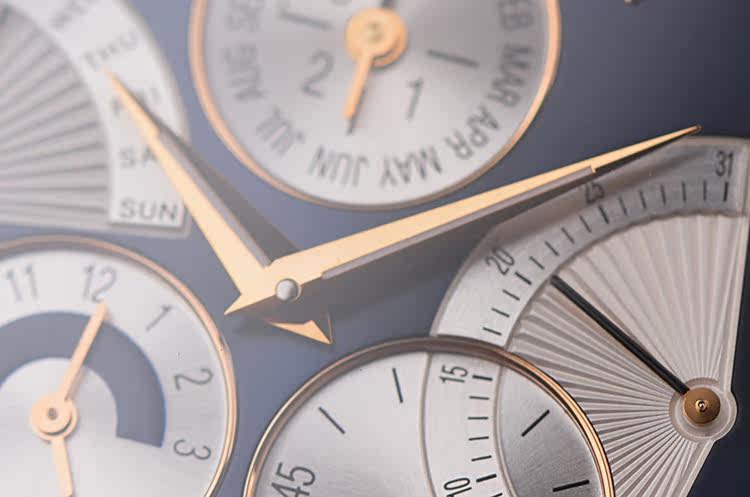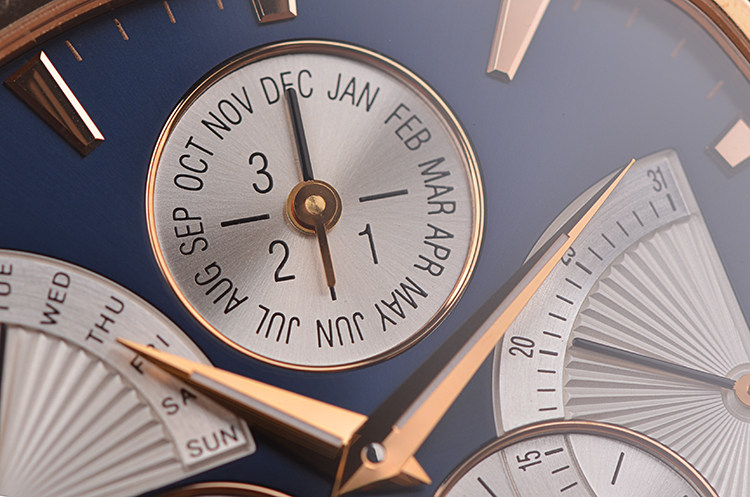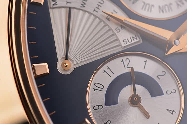 表盘:立体蓝色万年历表盘,两地时及昼夜显示