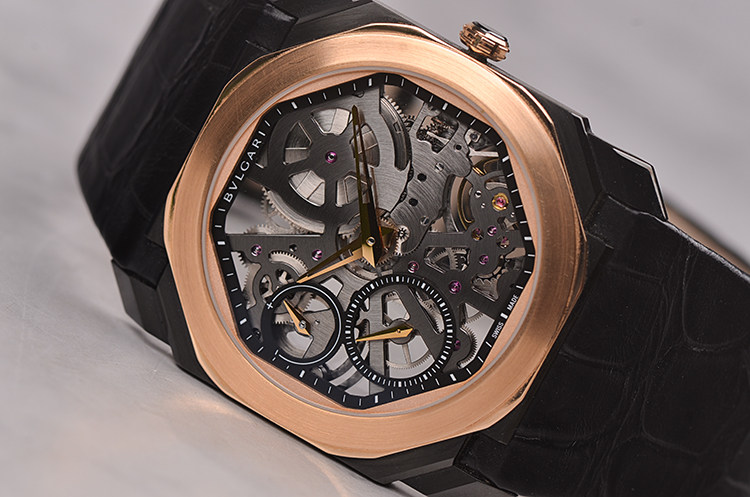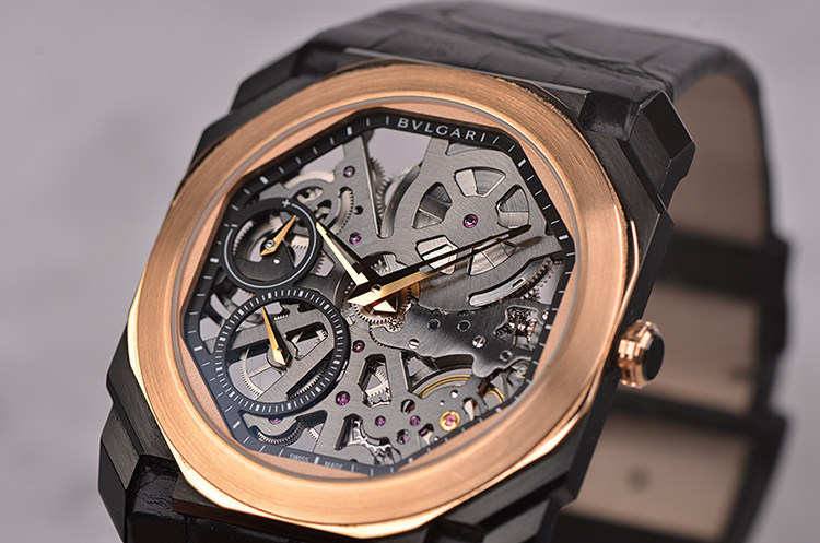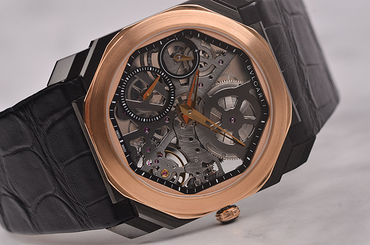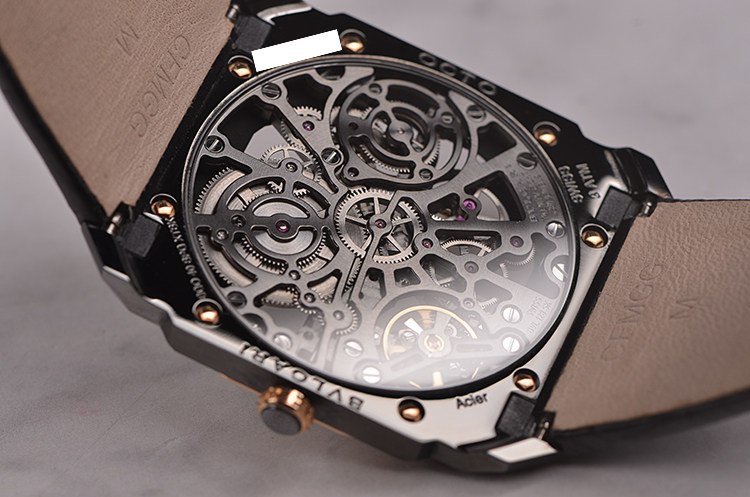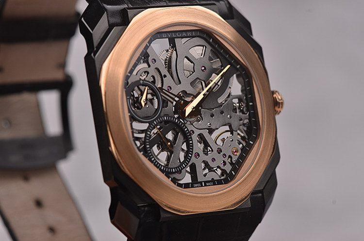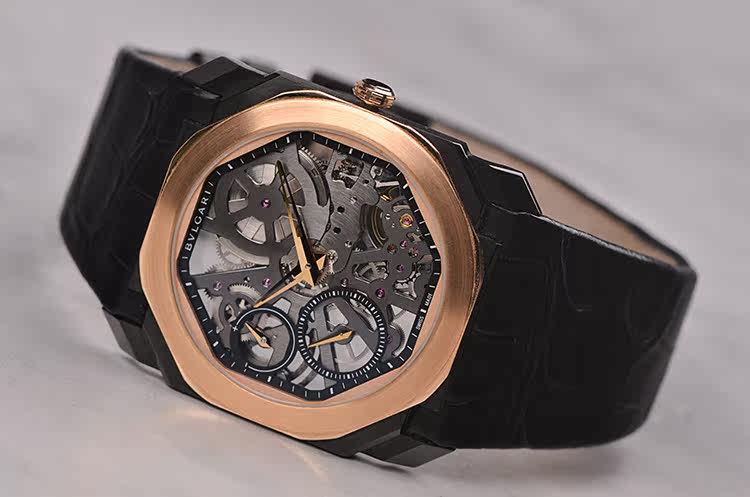 八角形玫瑰金及PVD钢全镂空动显小三针手上链皮带男表
