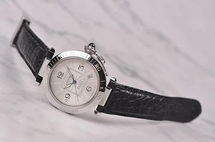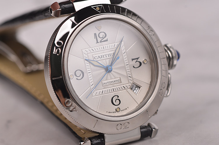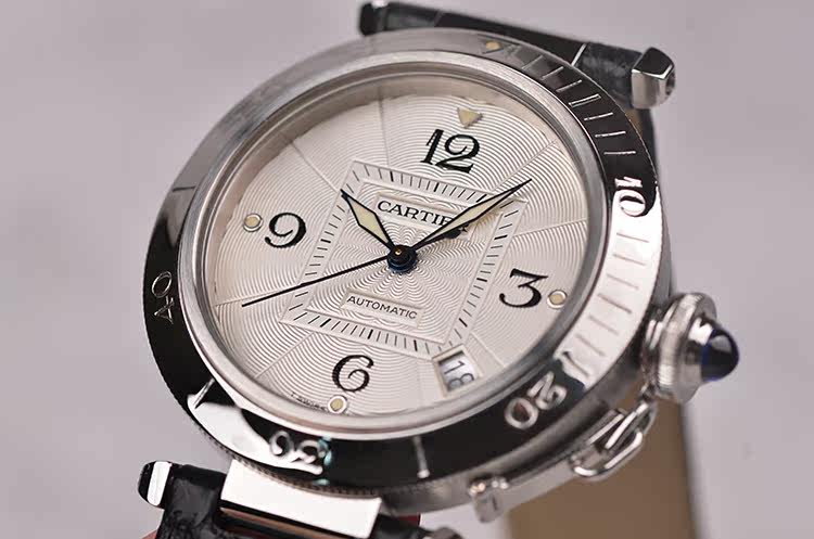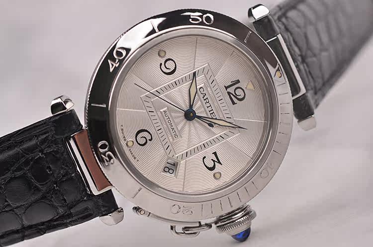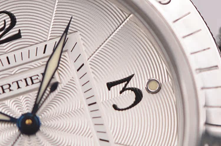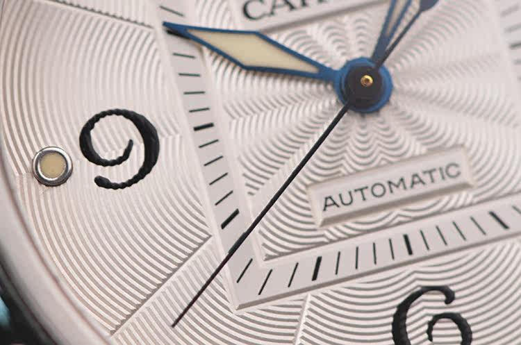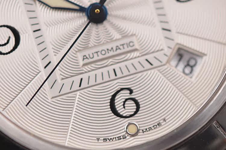 表盘:立体银白色太阳纹表盘,蓝钢指针,日历显示