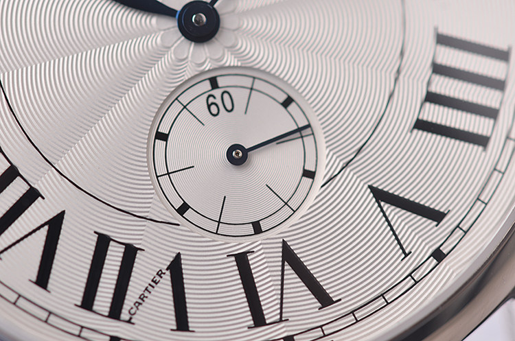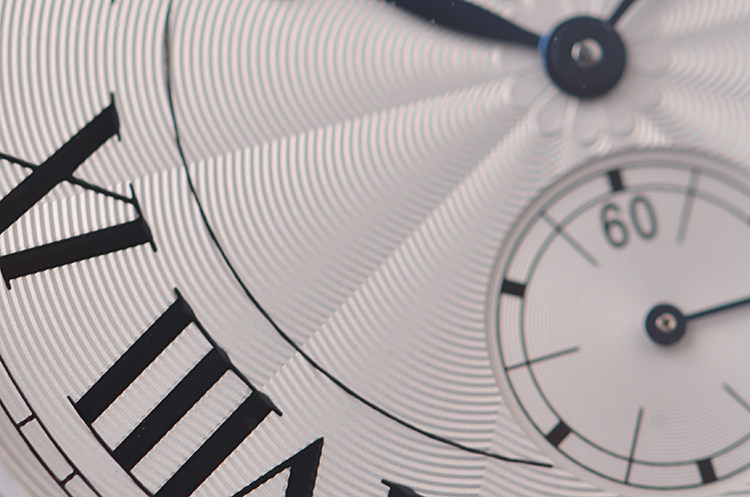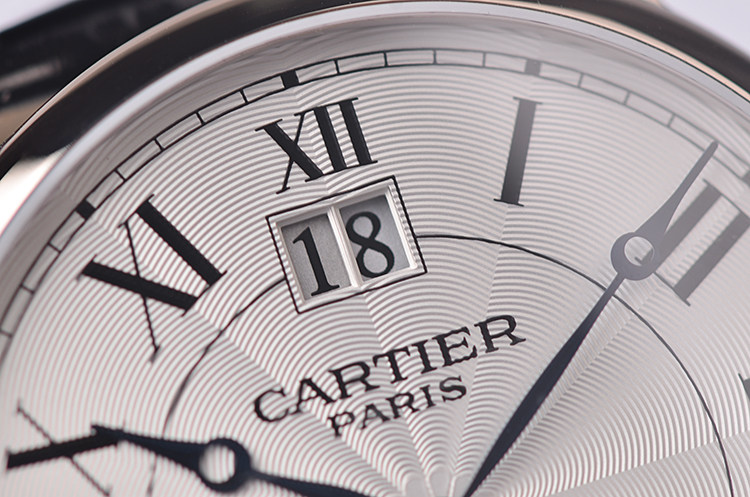 表盘:立体银白色太阳纹表盘,罗马数字刻度,大日历视窗,蓝钢鱼眼针
