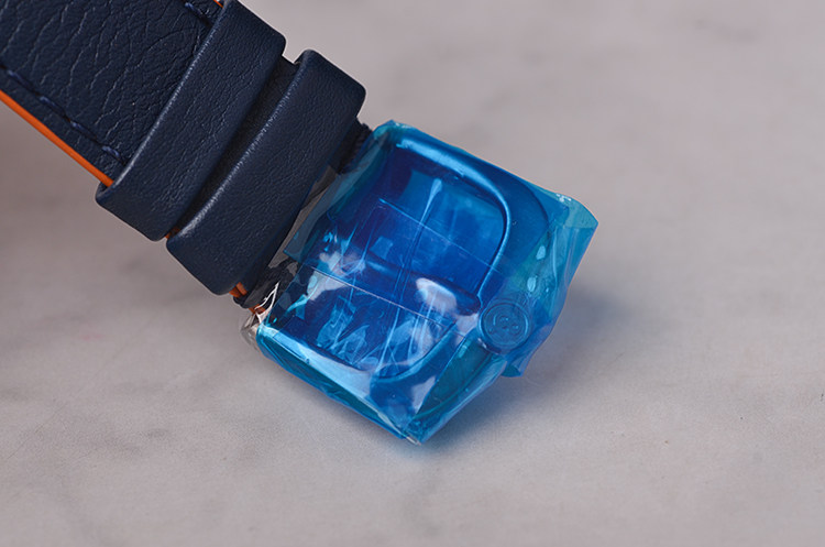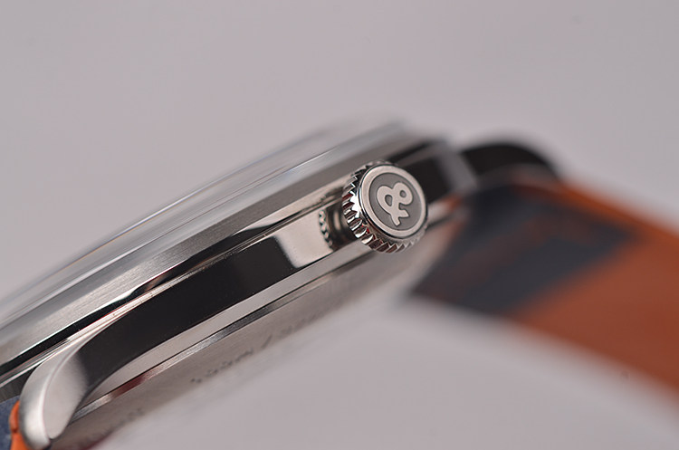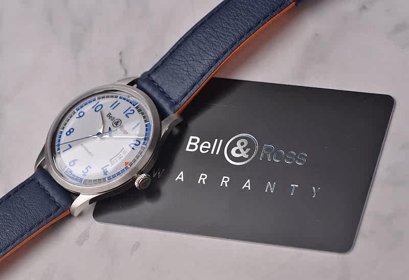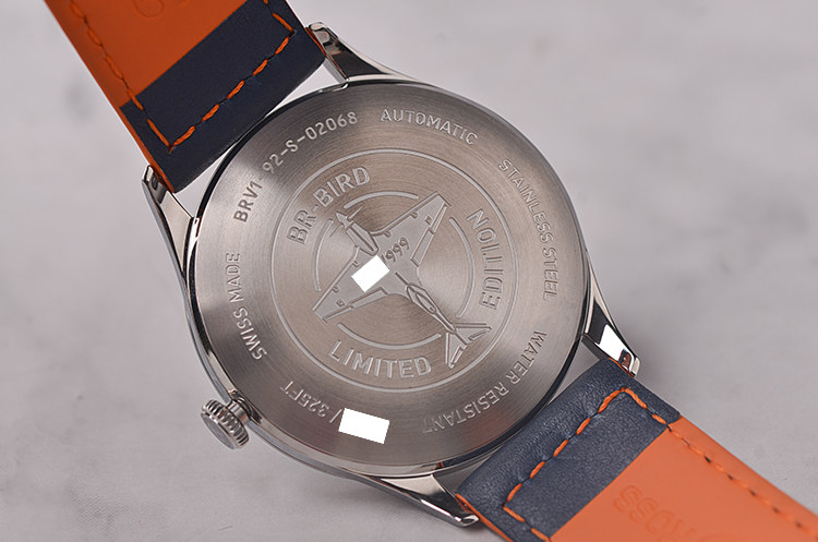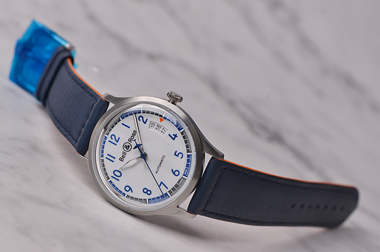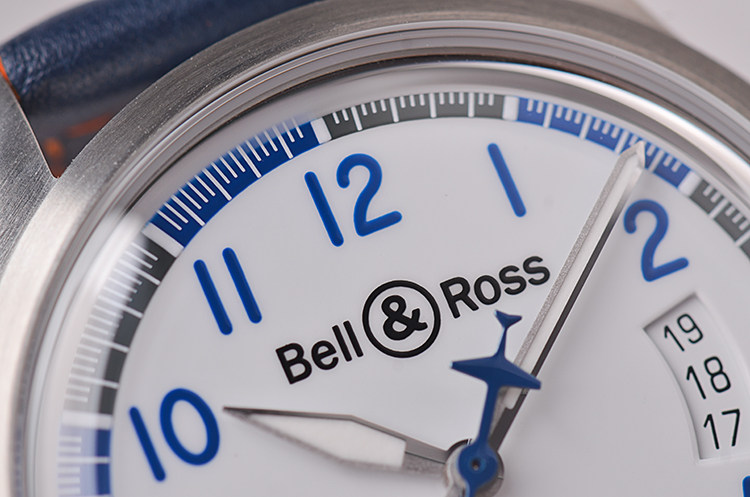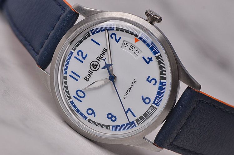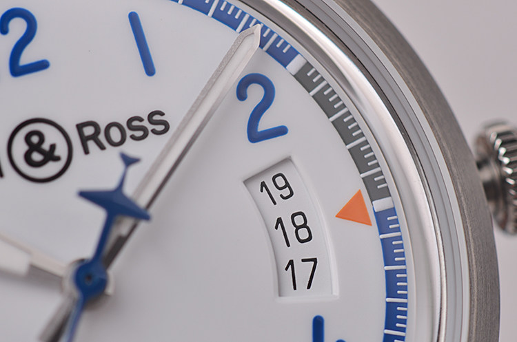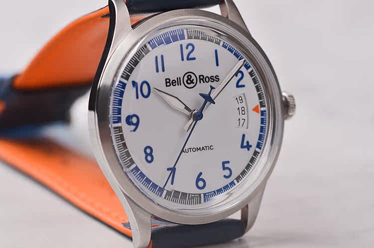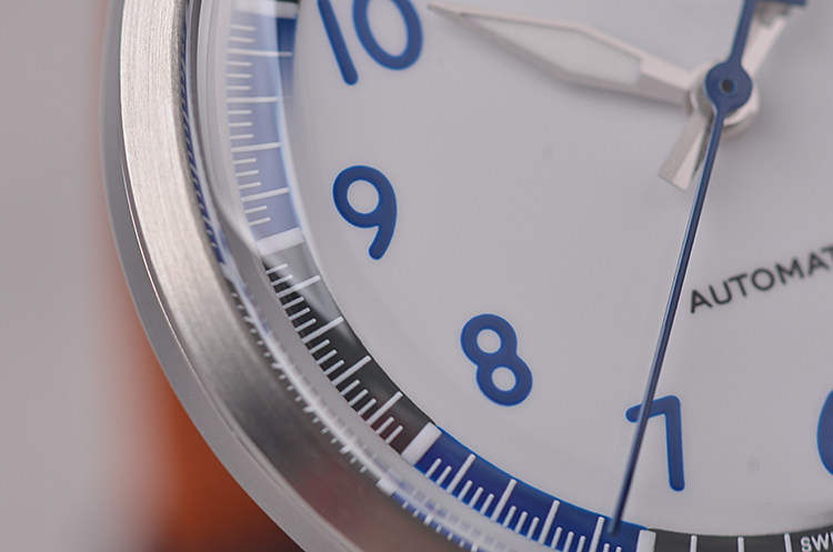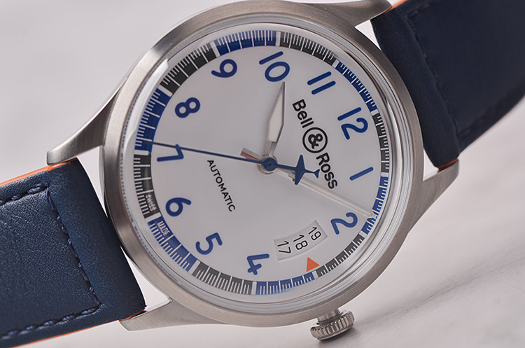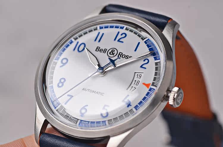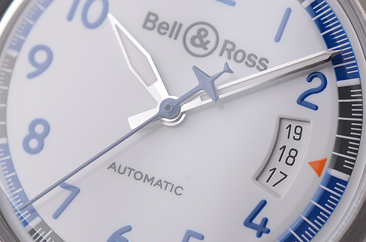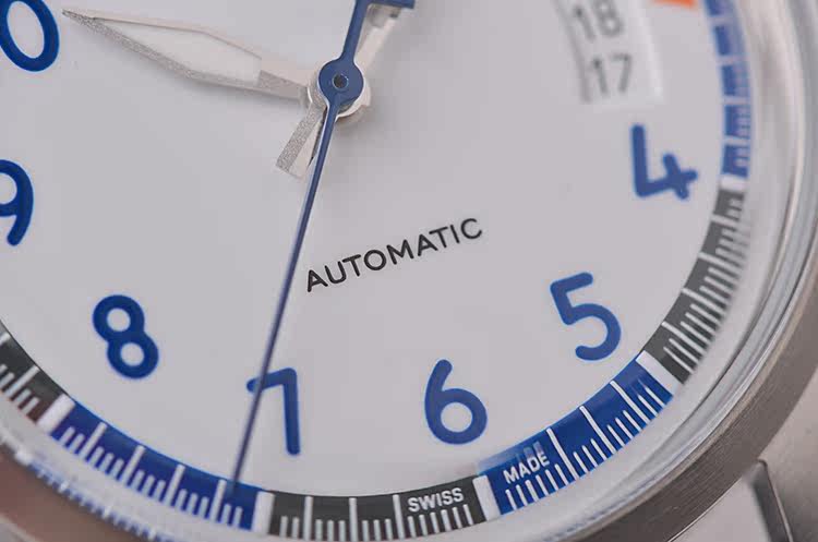 表盘: 立体白色表盘,蓝棕双色轨道刻度,蓝色阿拉伯数字时标,飞机造型秒针,日历显示