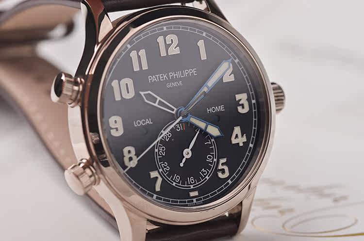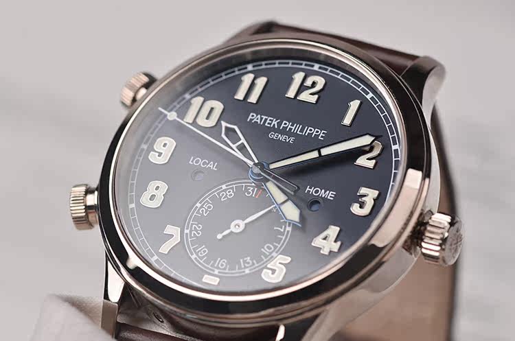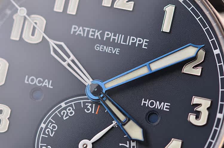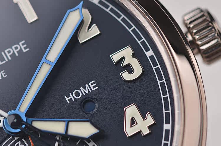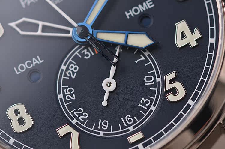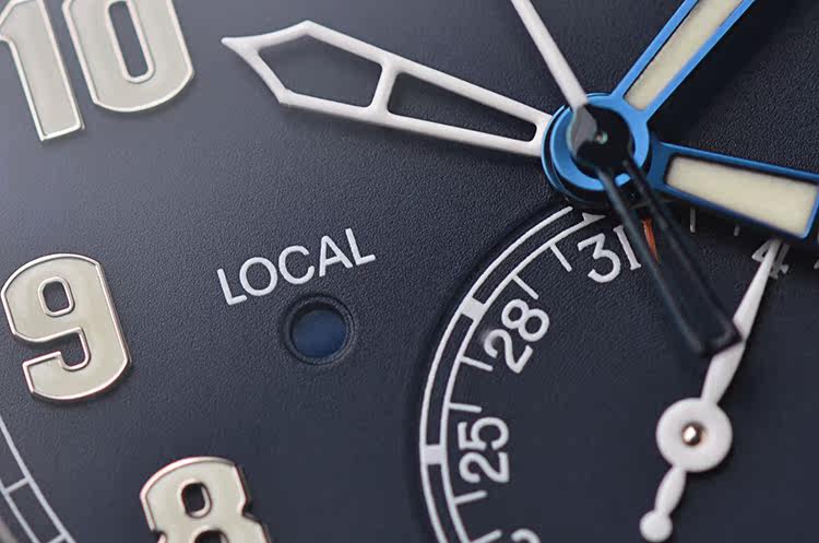 表盘:立体蓝黑色表盘,夜光阿拉伯数字刻度及时分针,两地时,指针日历,昼夜显示功能