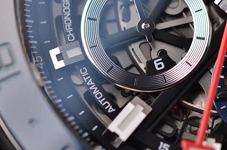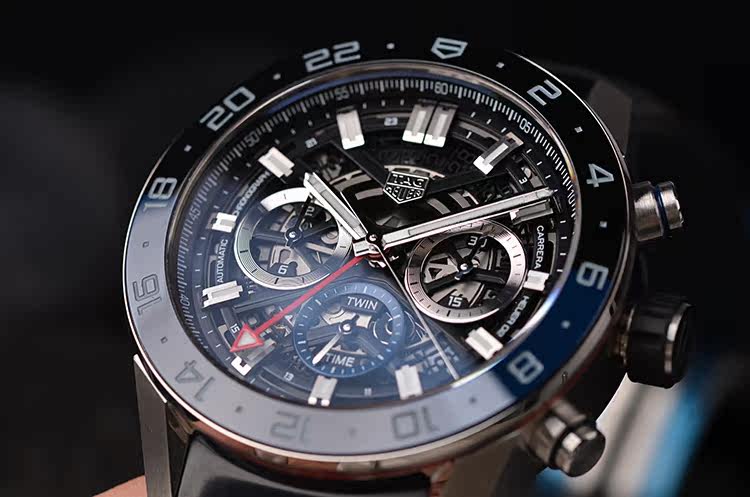 卡莱拉系列蓝黑陶瓷圈45MM镂空两地时计时日历自动机械胶带男表