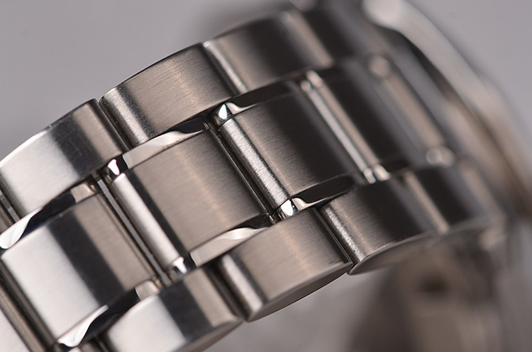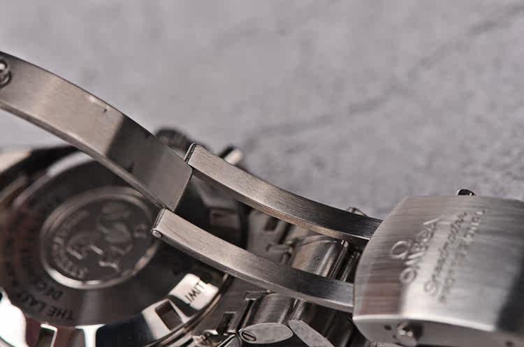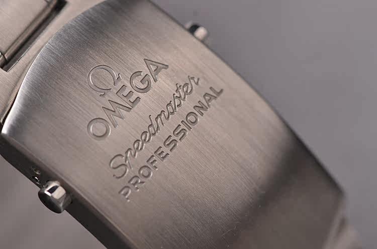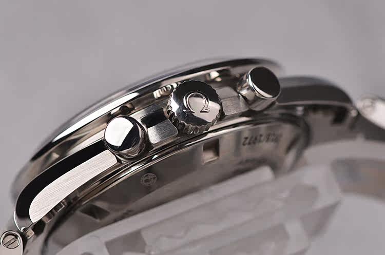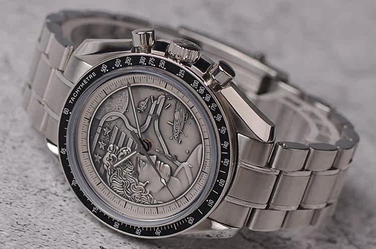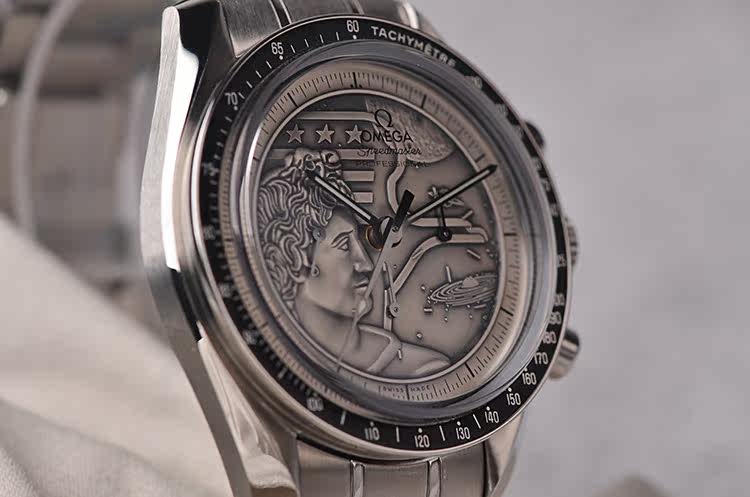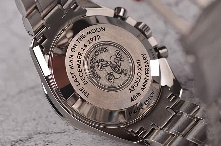 精钢表壳及链带,折叠式表扣。蓝宝石水晶镜面,立体925银阿波罗17号徽章浮雕表盘,夜光时分针,测速表圈。计时码表功能。口径42MM*14.8MM,防水50M。