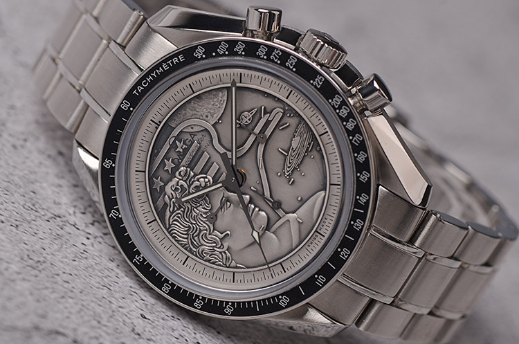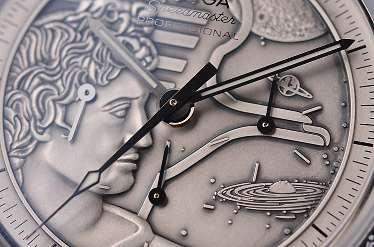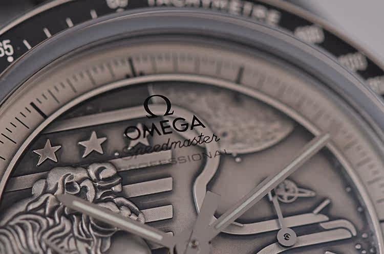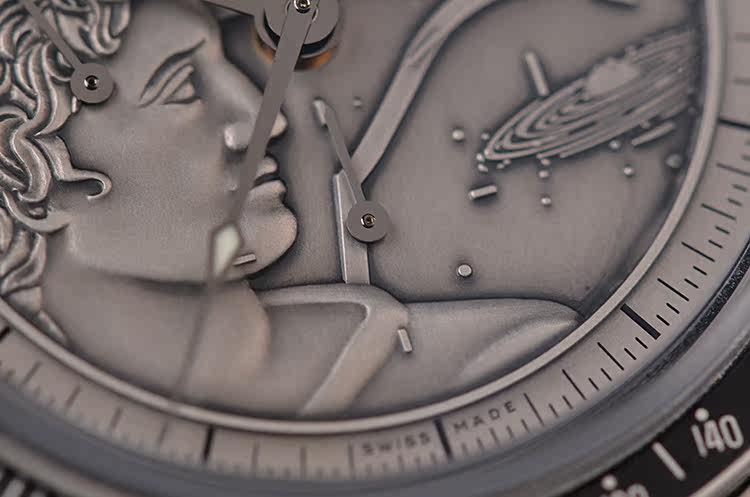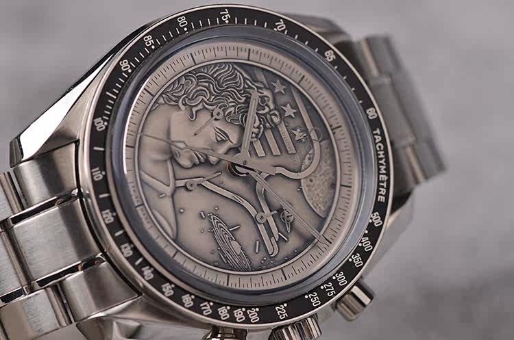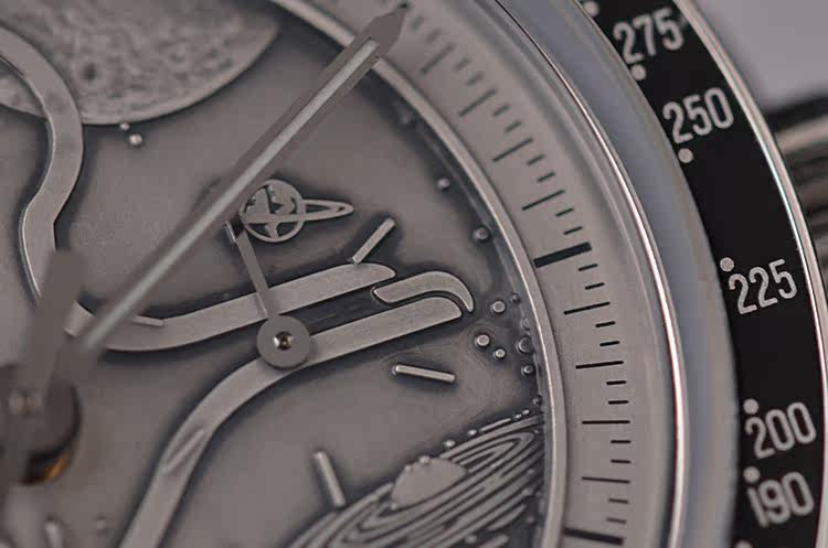此限量版超霸“阿波罗17号”月球表用于纪念1972年12月最后一次登月任务40周年纪念。腕表的925银质表盘饰有与阿波罗17号徽章相同的浮雕设计。小秒针表盘、30分钟计时小表盘、12小时计时小表盘及中央计时指针为表盘倍添姿彩。