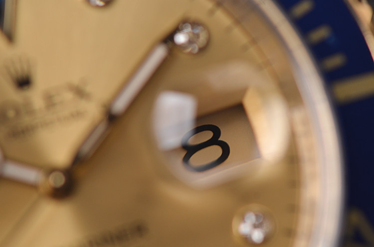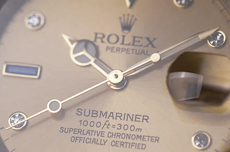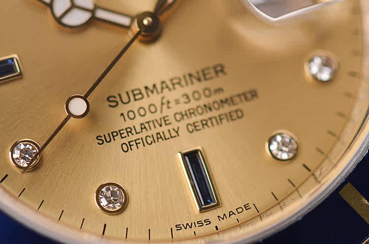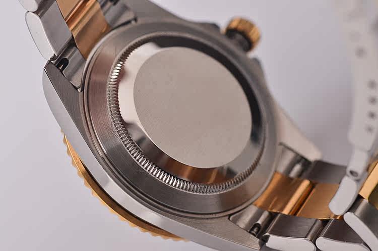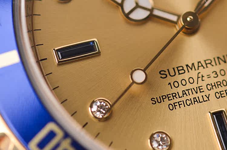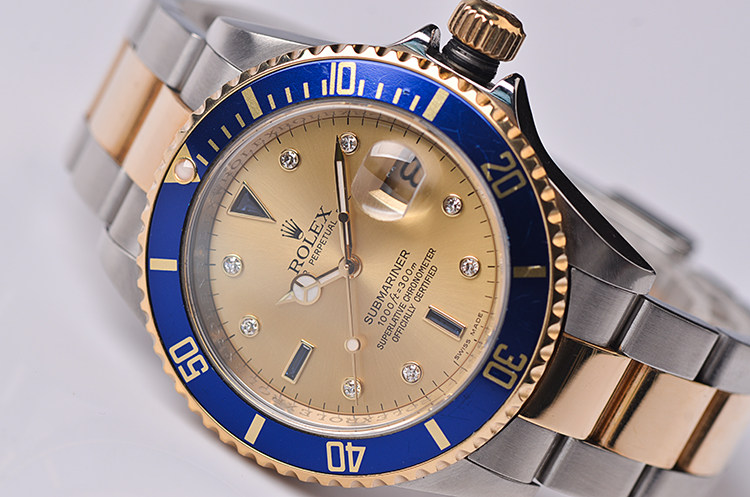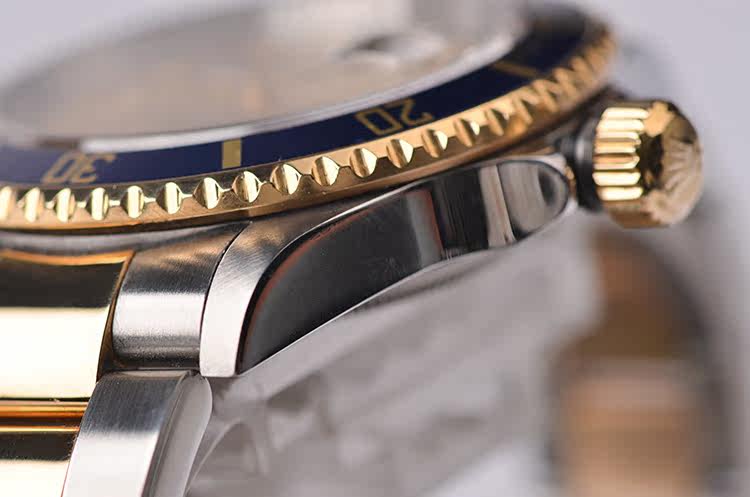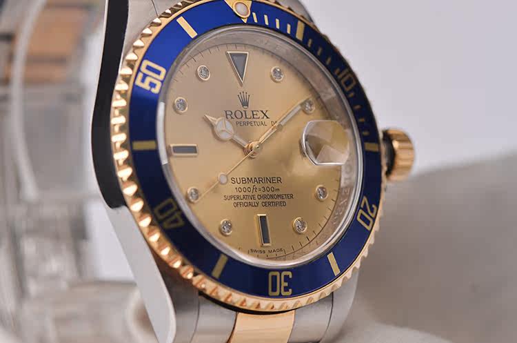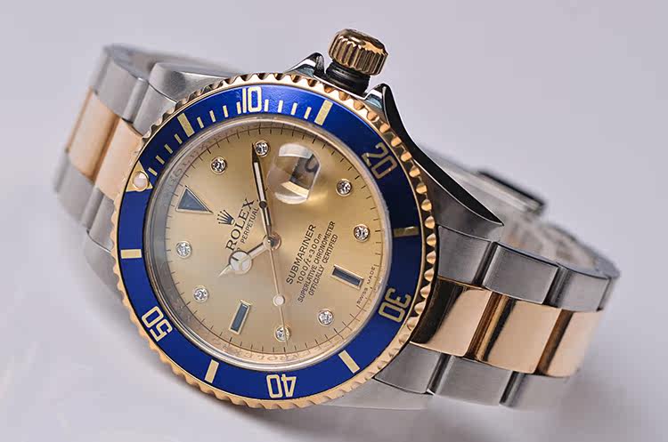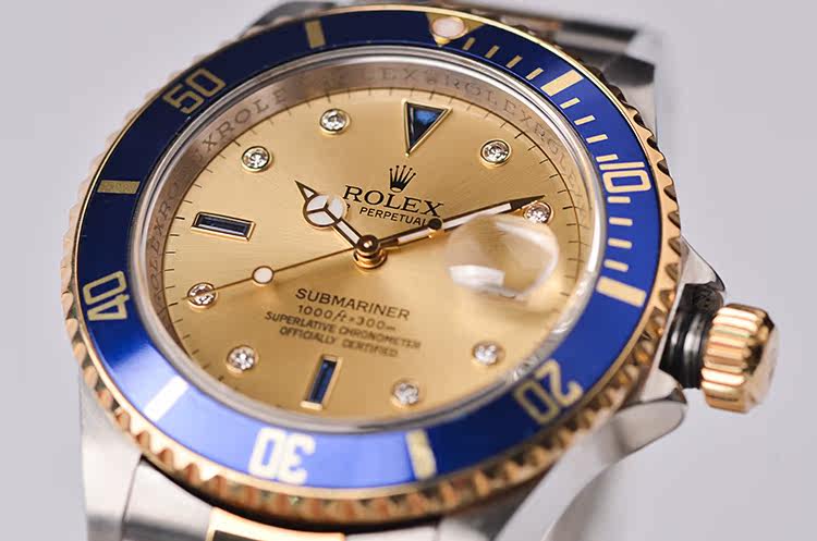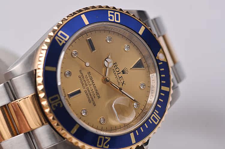 潜航者型黄金及钢蓝圈金色面蓝宝石及钻石刻度自动男表