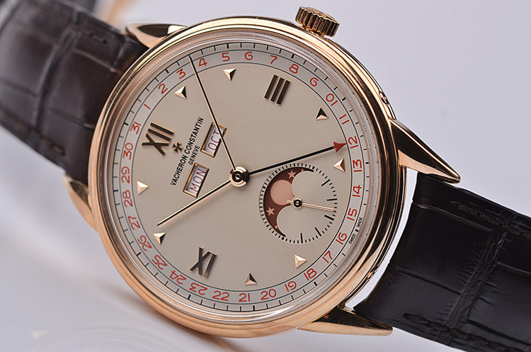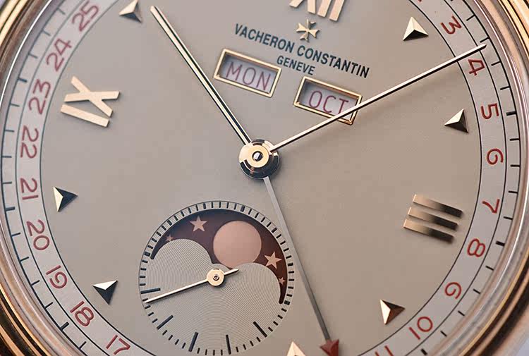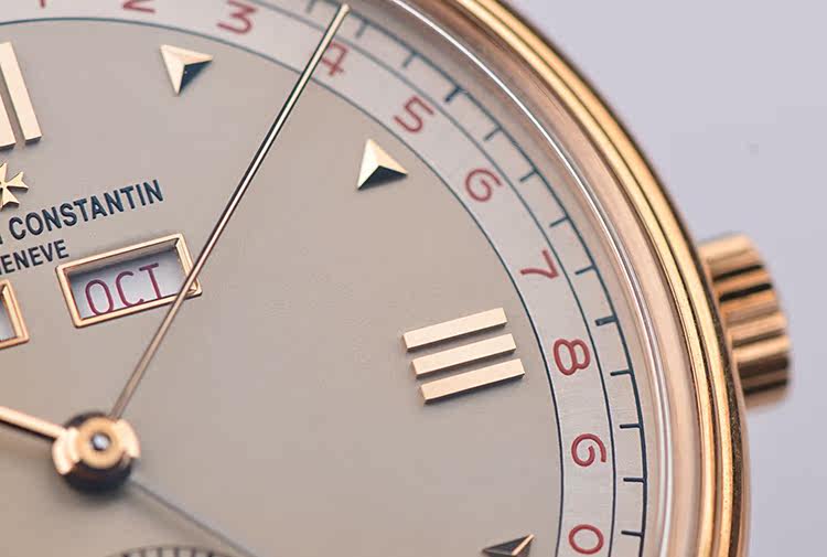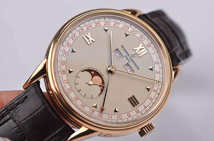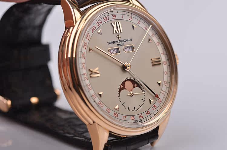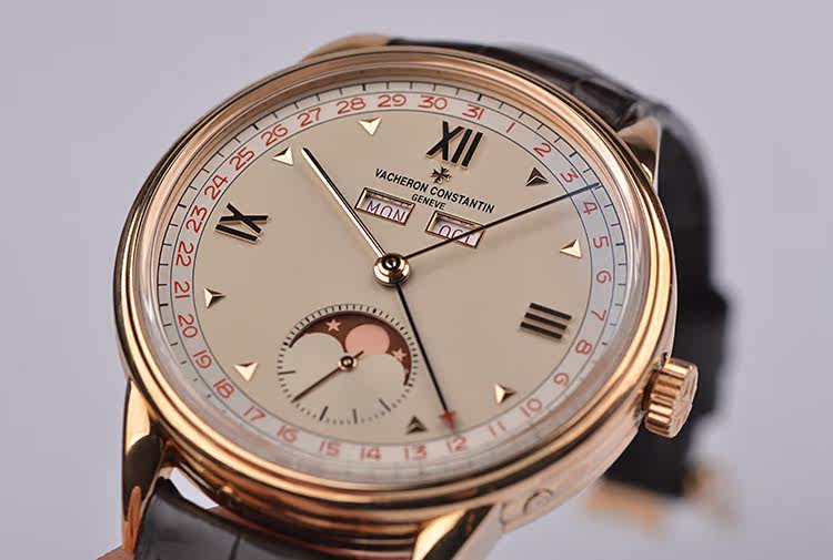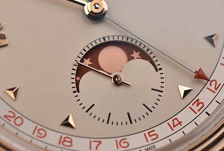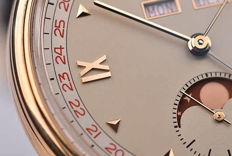 表盘:立体浅香槟色表盘,全历显示,红色月相,玫瑰金刻度及指针