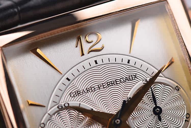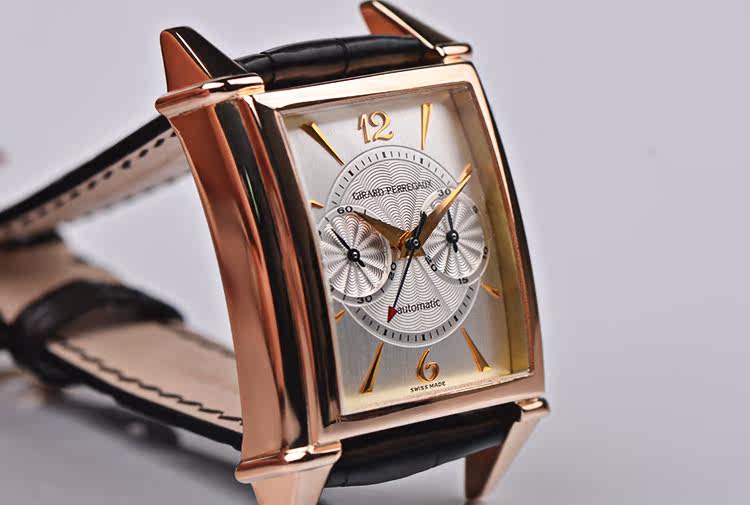 表盘:立体银白色计时表盘,玫瑰金刻度及时分针,蓝钢计时针