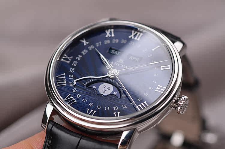 白金蓝面全历月相40MM自动机械折叠扣皮带男表