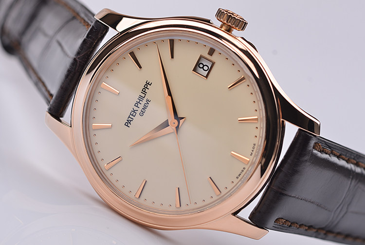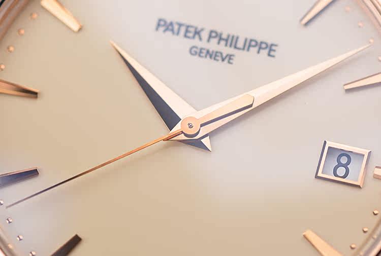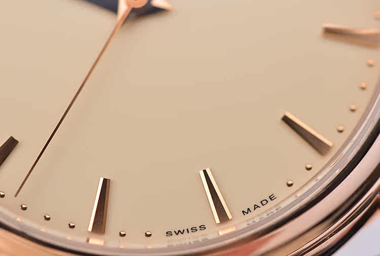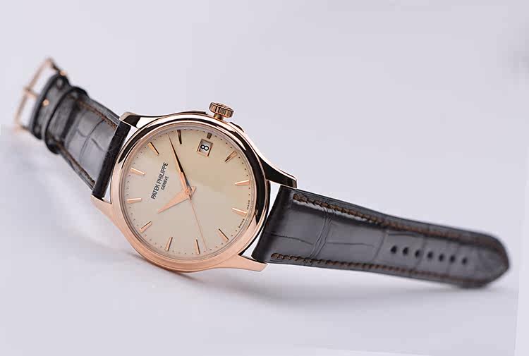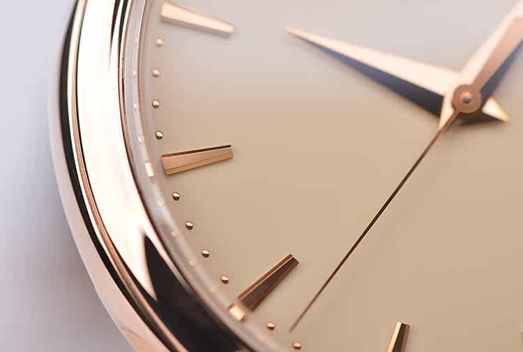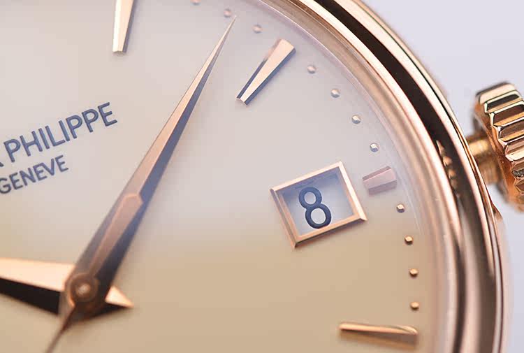 表盘:立体象牙白色表盘,玫瑰金刻度及指针,日历显示