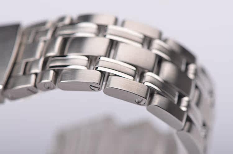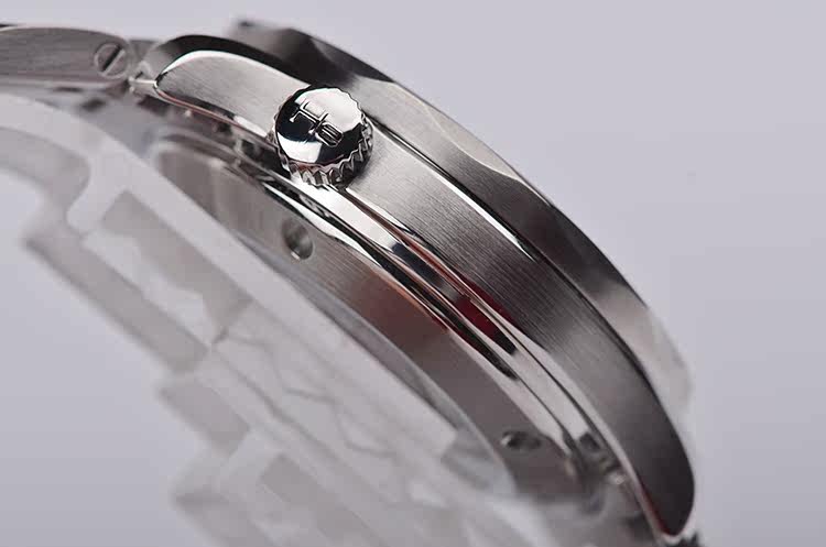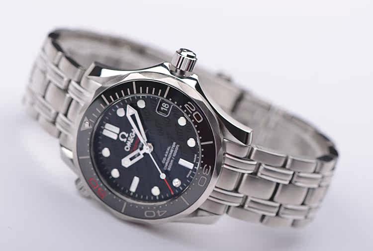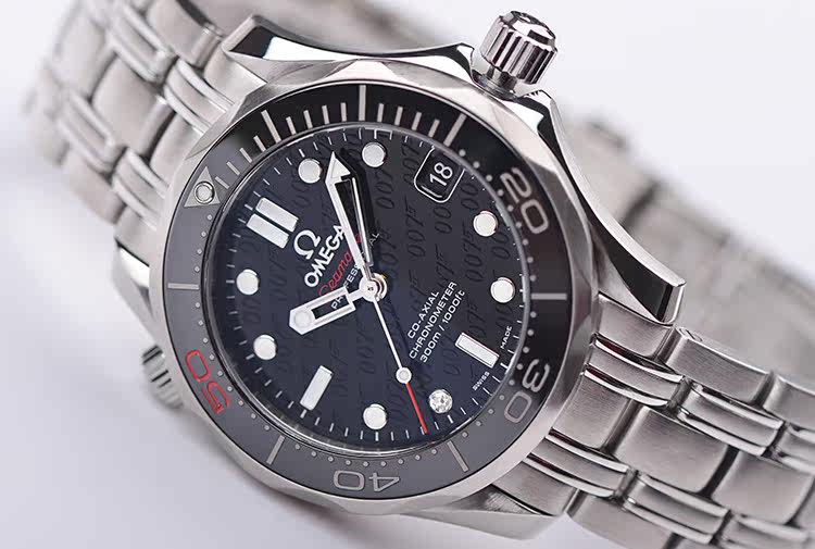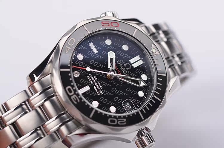 精钢表壳及链带,按压式折叠表扣。黑色可旋转夜光计时表圈,红色50刻度纪念詹姆斯邦德007五十周年。蓝宝石水晶镜面,立体黑色007主题表盘,夜光指针及刻度,7点位时标镶嵌一颗天然美钻(0.01克拉),表示此表款是向007系列电影的历史致敬的特别之作。3点位日历显示功能。枪膛线纹路底盖,表壳侧面10点位表冠排氦气阀门装置,旋入式防水表冠。口径36.25MM*12MM,男女合用尺寸。防水300M。