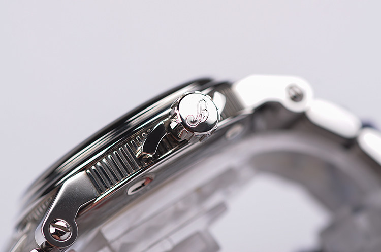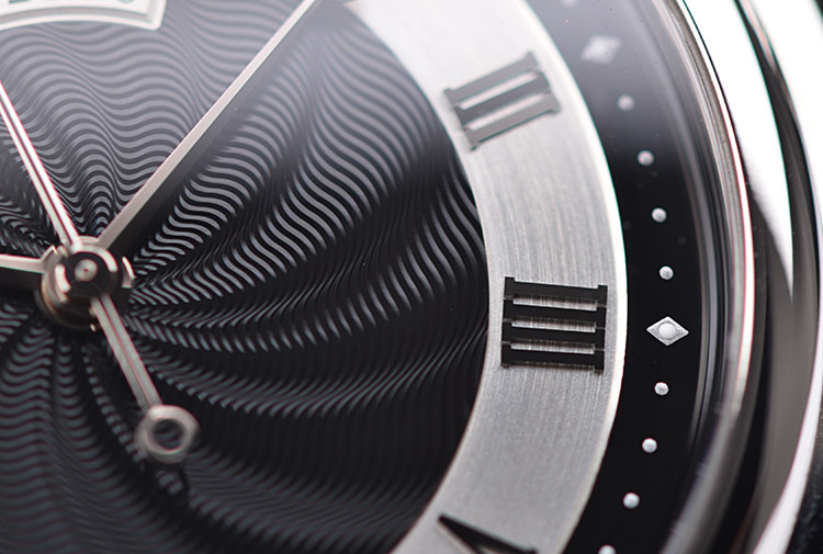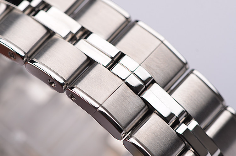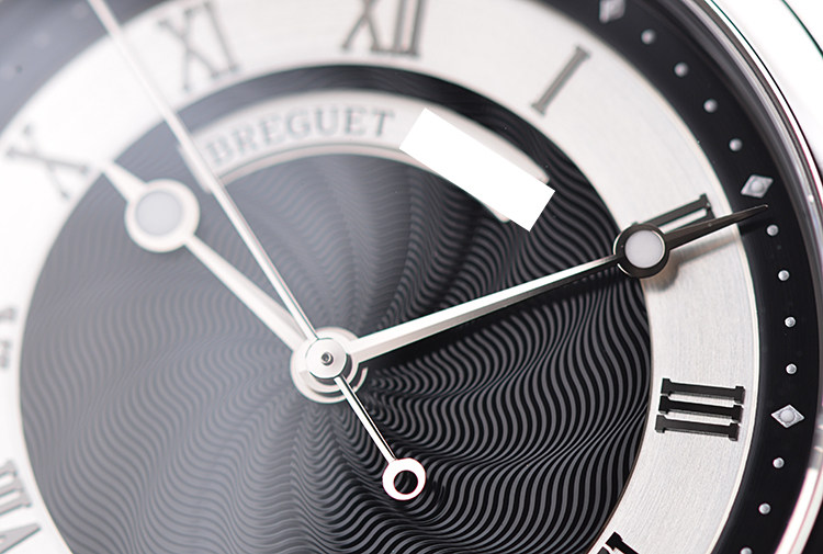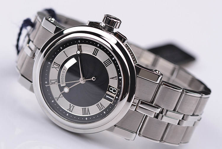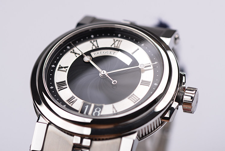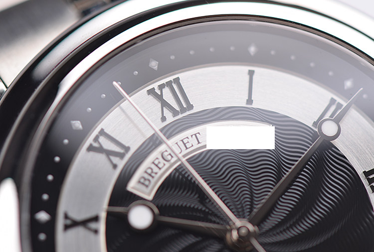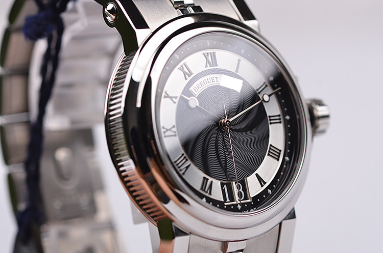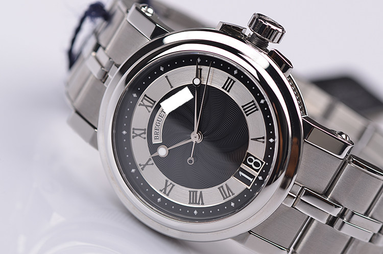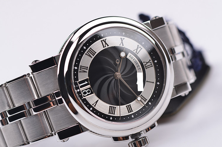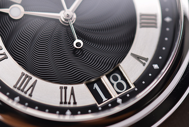 表盘:银黑双色白金镀银镌刻表盘,阿拉伯数字刻度,大日历视窗
