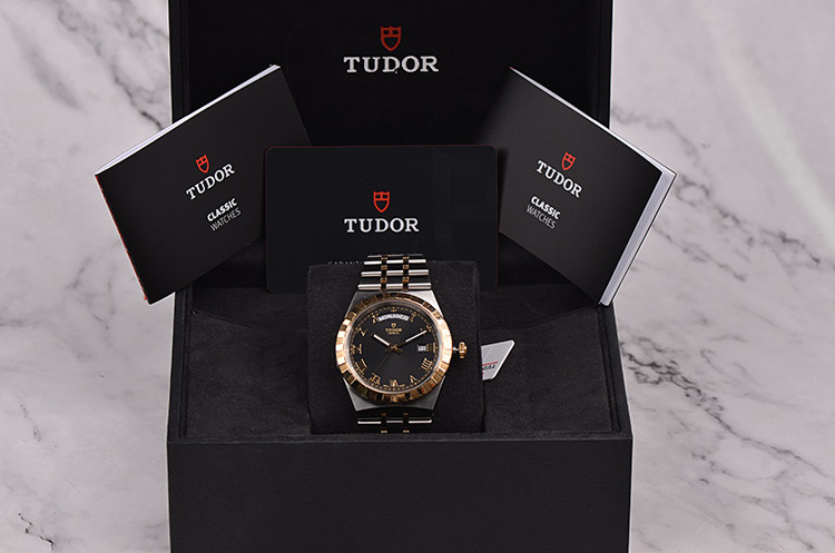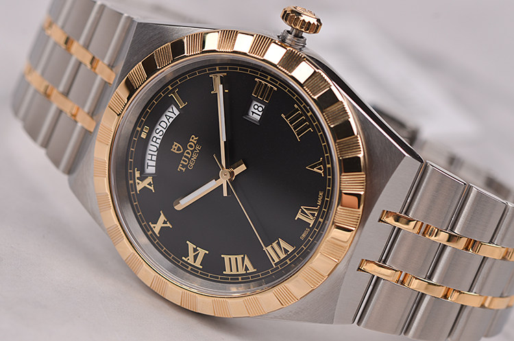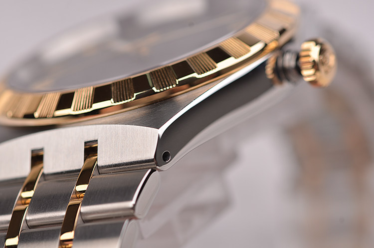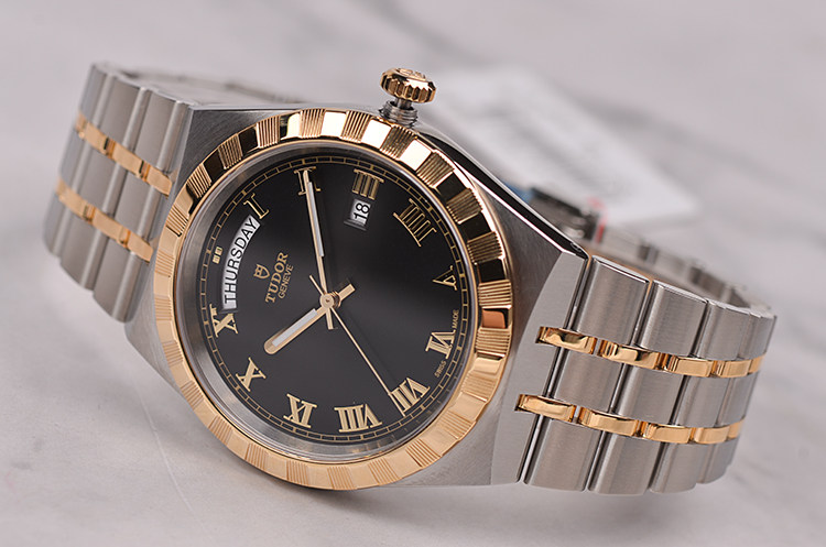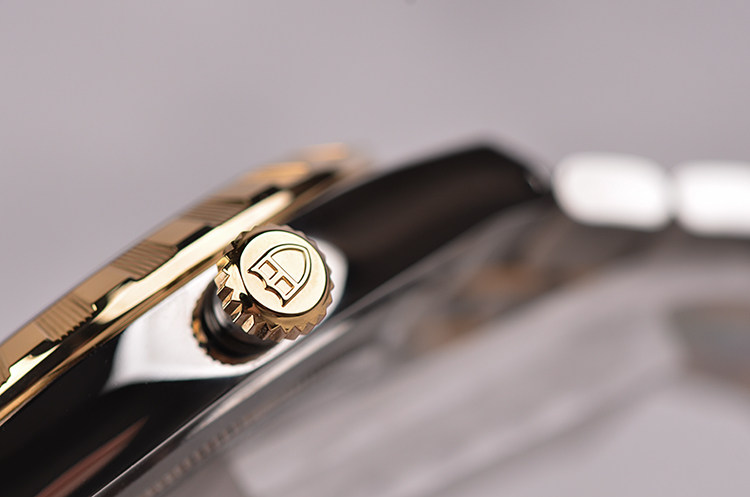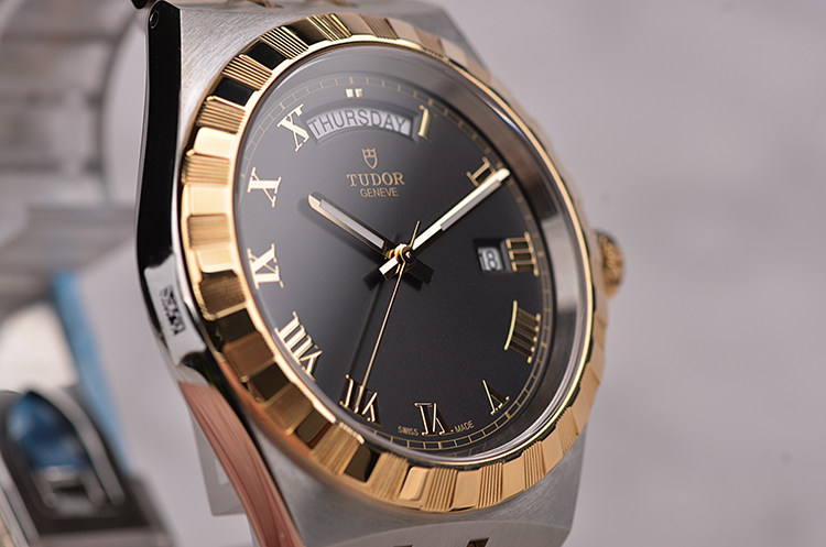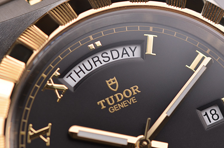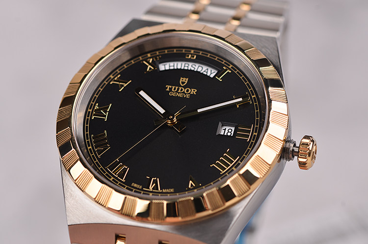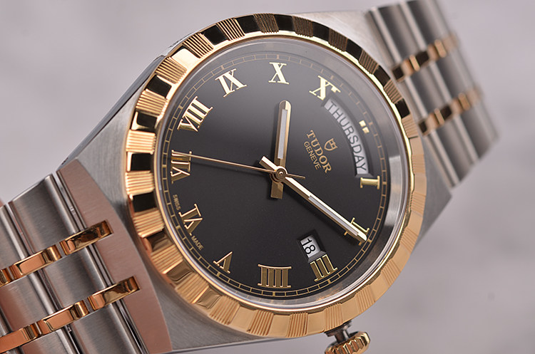 皇家系列黄金及钢黑面星期日历自动机械男表